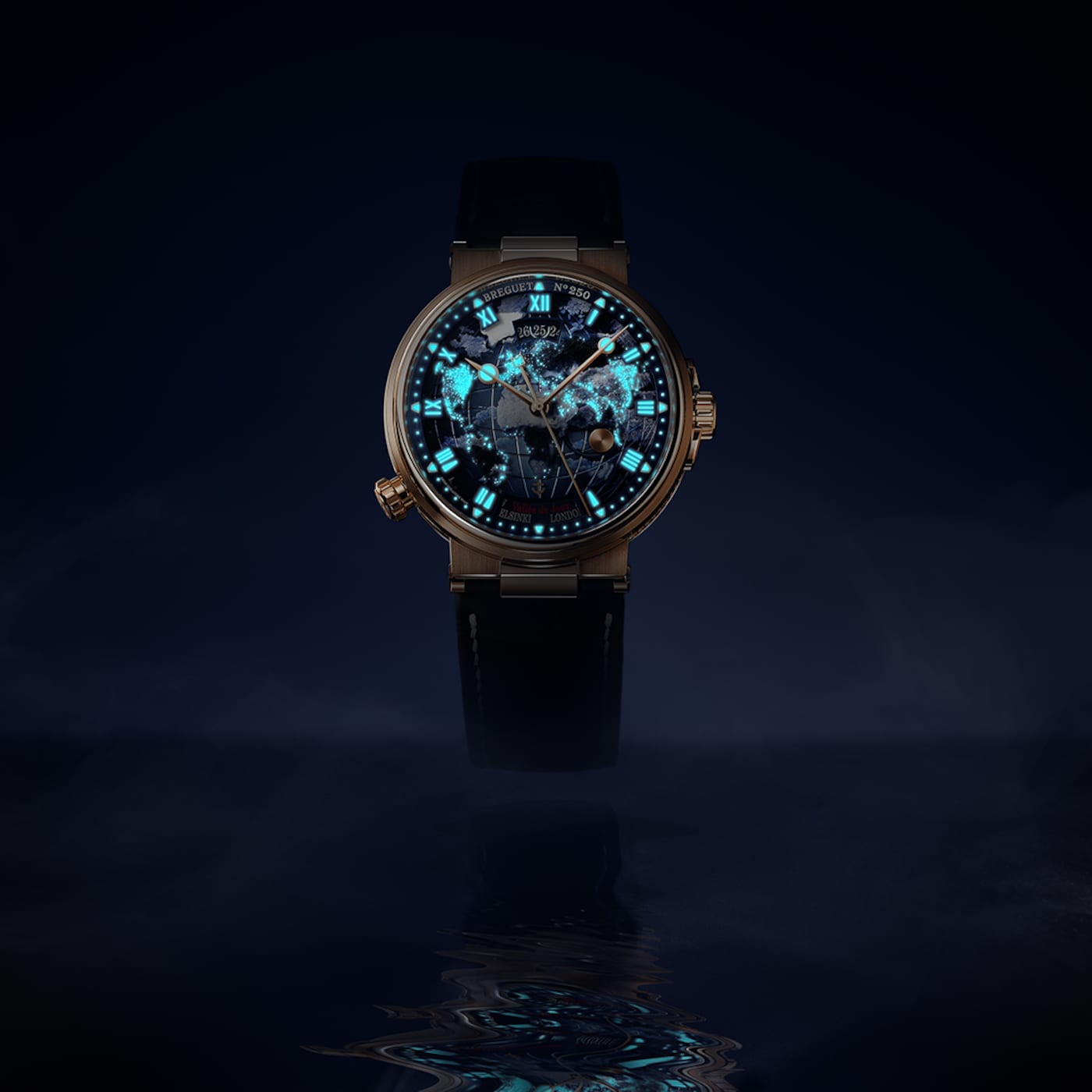 브레게 골드 소재로 선보이는 것은 이번이 처음인 마린 오라문디 5555는 특허 출원 중인 새로운 인광 에나멜을 사용했습니다. 이 시계를 소유하게 될 50명의 수집가는 24개 시간대를 대표하는 도시 이름을 원하는 대로 맞춤 설정할 수 있습니다.