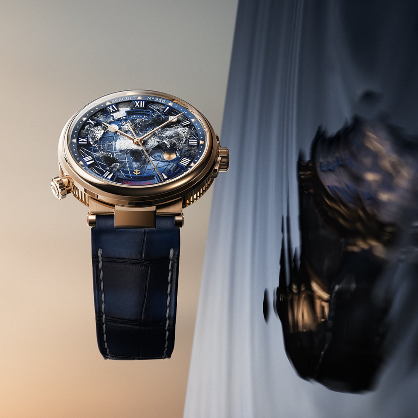 250주년을 기념하여 놀라움을 선사하고 있는 브레게가 공개하는 다섯 번째 챕터는 새로운 버전의 리미티드 크리에이션 ‘마린 오라문디 5555’입니다. 이 타임피스는 기요셰와 사파이어를 겹친 다이얼로 장인 정신에 경의를 표합니다. 나사(NASA)의 “블랙 마블(Black Marble)”에서 영감을 받은 이 특별한 다이얼은 우주에서 본 밤의 지구를 담고 있습니다.