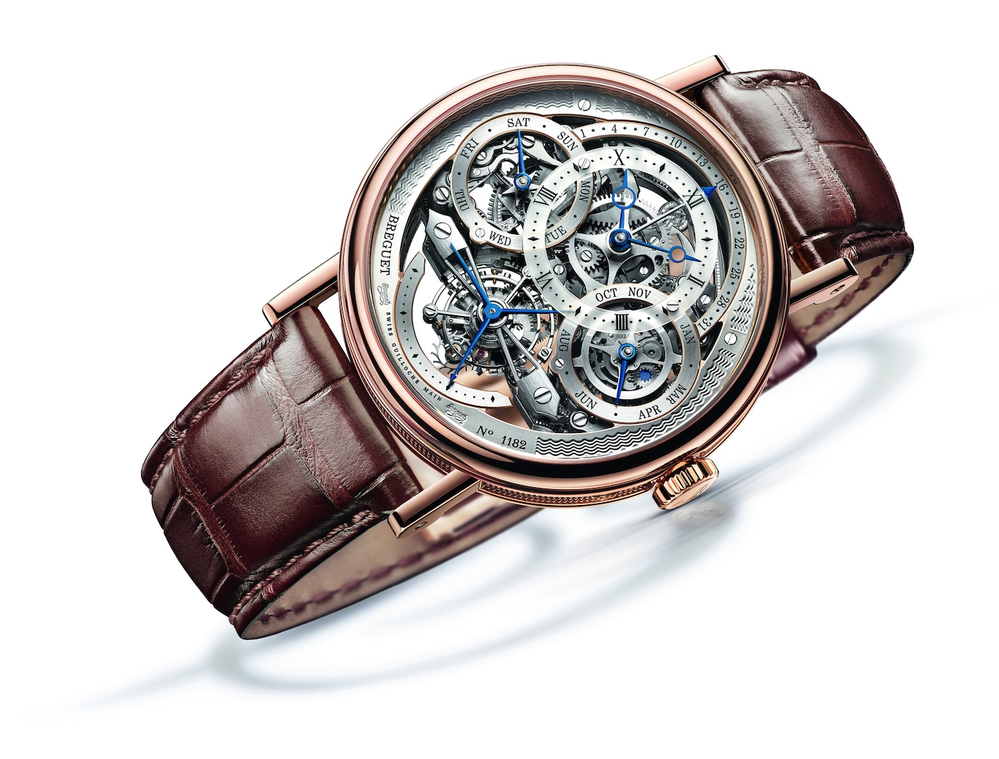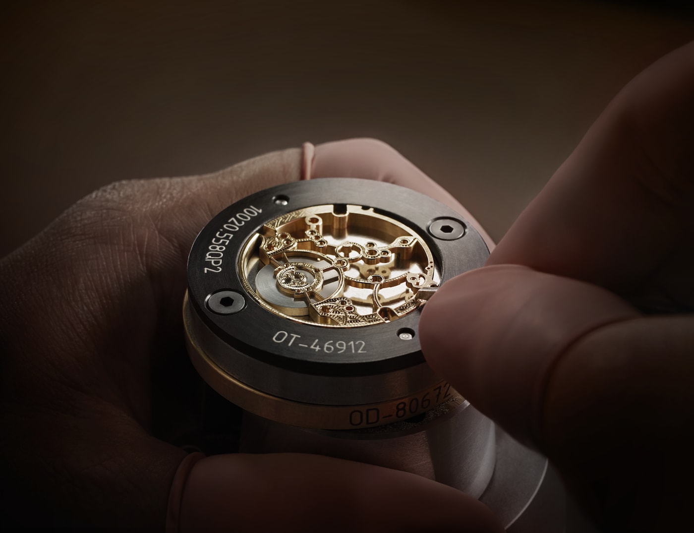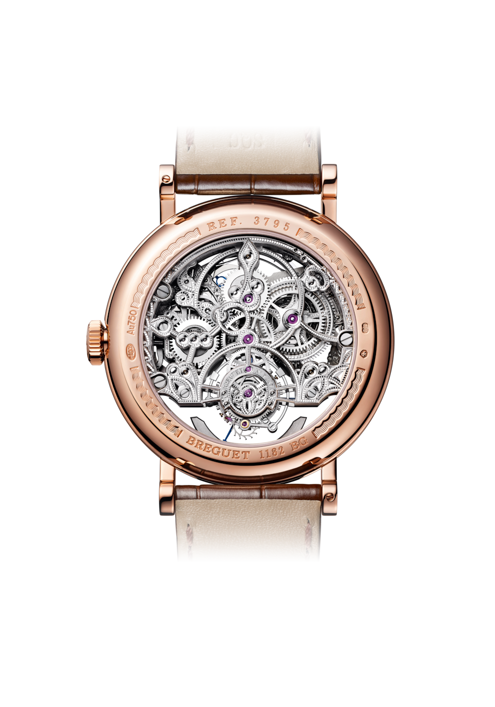 Der undurchsichtige, mit römischen Ziffern verzierte Stundenring hebt sich stark vom gesamten Zifferblatt ab und lenkt den Blick auf die wichtigsten Informationen. Die Breguet-Zeiger aus gebläutem Stahl mit der Pomme-Spitze ermöglichen ein einfaches Ablesen der Uhrzeit. Unterhalb der Scheibe ist das Zifferblatt mit einer „Clous de Paris“-Guillochierung veredelt. Es weist außerdem ein retrogrades Datum bei 12 Uhr auf, das durch die Anzeigen von Wochentag und Monat ergänzt wird. Letztere sind bei 9 Uhr und 3 Uhr angebracht. Das Tourbillon, das eine Umdrehung pro Minute vollführt, befindet sich bei 6 Uhr und bildet ein Pendant zum Stundenring.