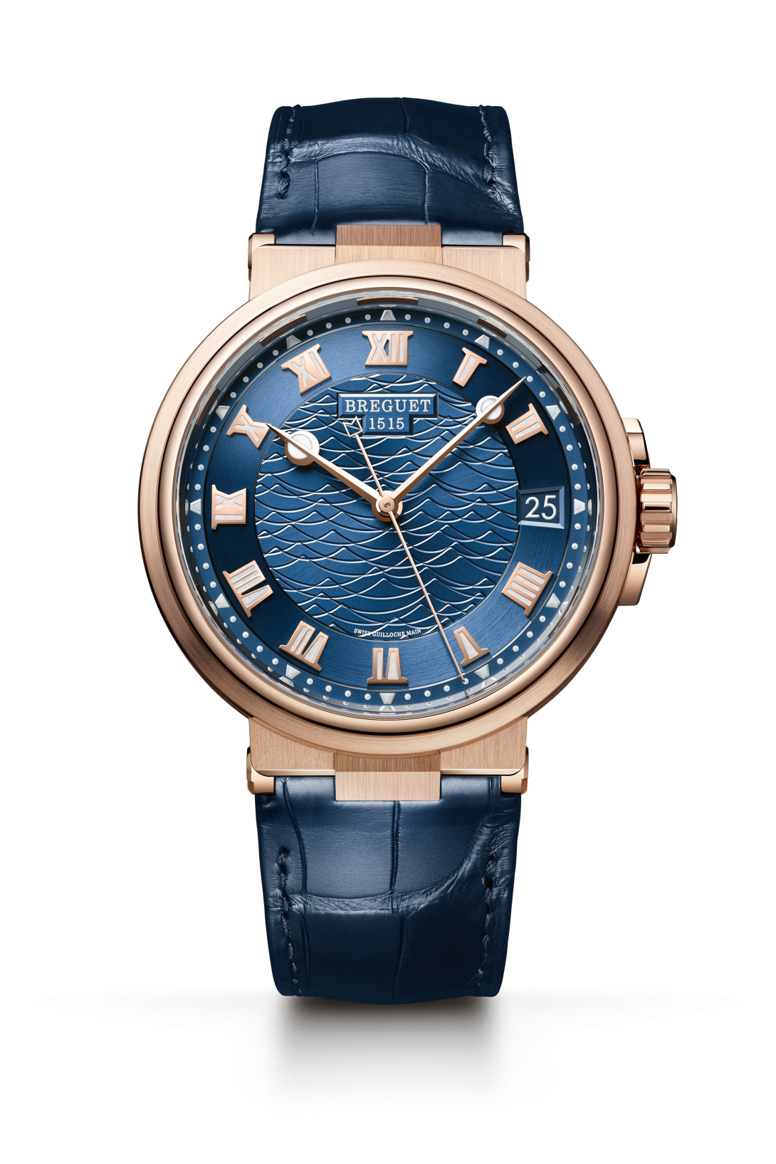 Viele Details erinnern an den Charakter der Kollektion Marine, wie etwa der Sekundenzeiger, der eine Seeflagge mit Breguet-Initiale als Gegengewicht trägt. Die Krone dieses 40 mm großen Zeitmessers ist von einem wellenförmigen Dekor umgeben. Auf der Rückseite gibt ein offener Saphirglasboden den Blick auf einen Automatikmechanismus frei, dessen Schwungmasse an ein Steuerrad erinnert.