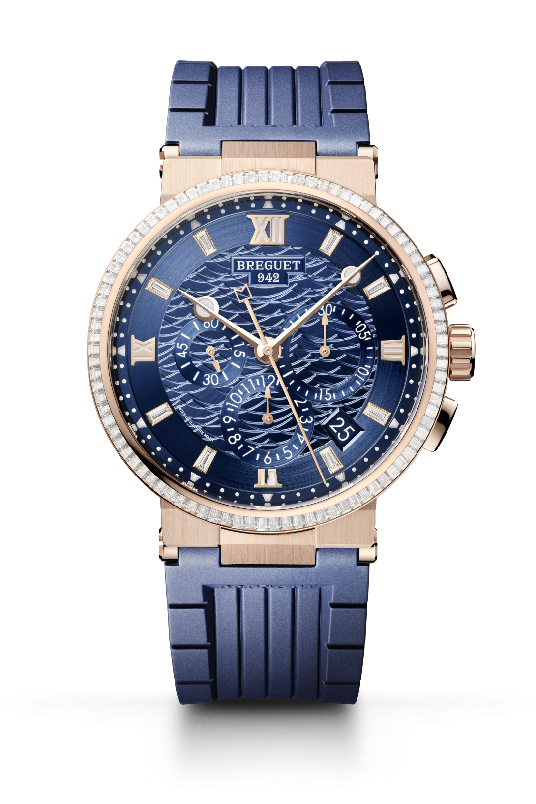 Die Zeit wird mithilfe des größten Zeigers angezeigt, erkennbar an seinem Ende, das an ein „B“ aus der Welt der Nautik erinnert. Die beiden anderen Zeiger – für die Stunde und die Minuten – besitzen den für Breguet typischen Stil. Drei Zähler bei 3, 6 und 9 Uhr, die 30 Minuten, 12 Stunden und 60 Sekunden anzeigen, vervollständigen die Zeitanzeige dieser Uhr. Um das Datum abzulesen, genügt ein Blick in das Fenster zwischen 4 und 5 Uhr. Fast hundert Diamanten im Baguetteschliff auf dem Zifferblatt und der Lünette tragen zum Glanz dieser Kreation mit einem Durchmesser von 42,3 mm bei.