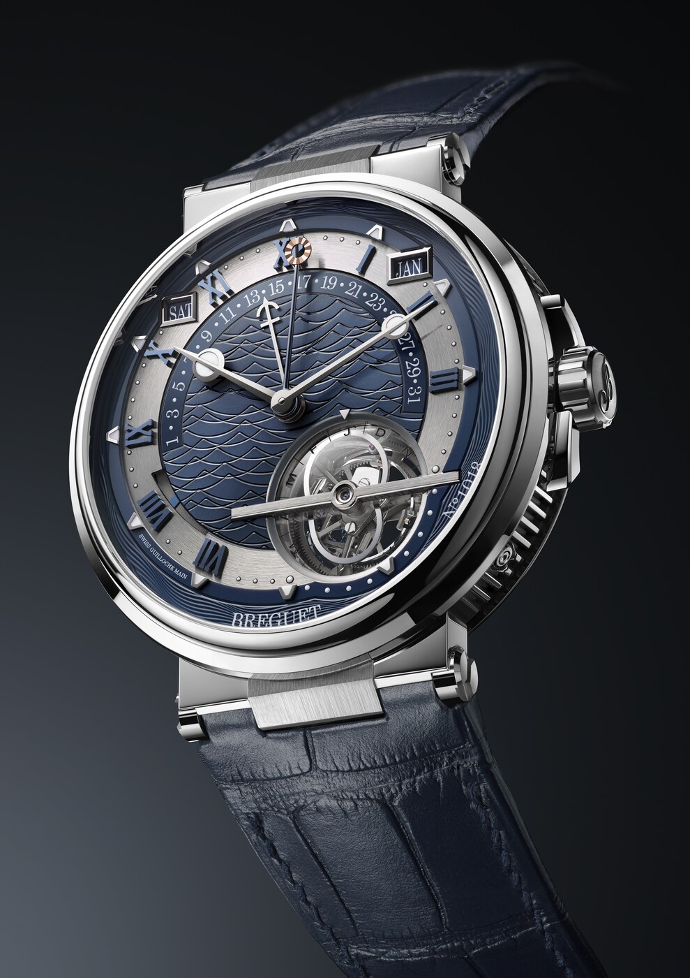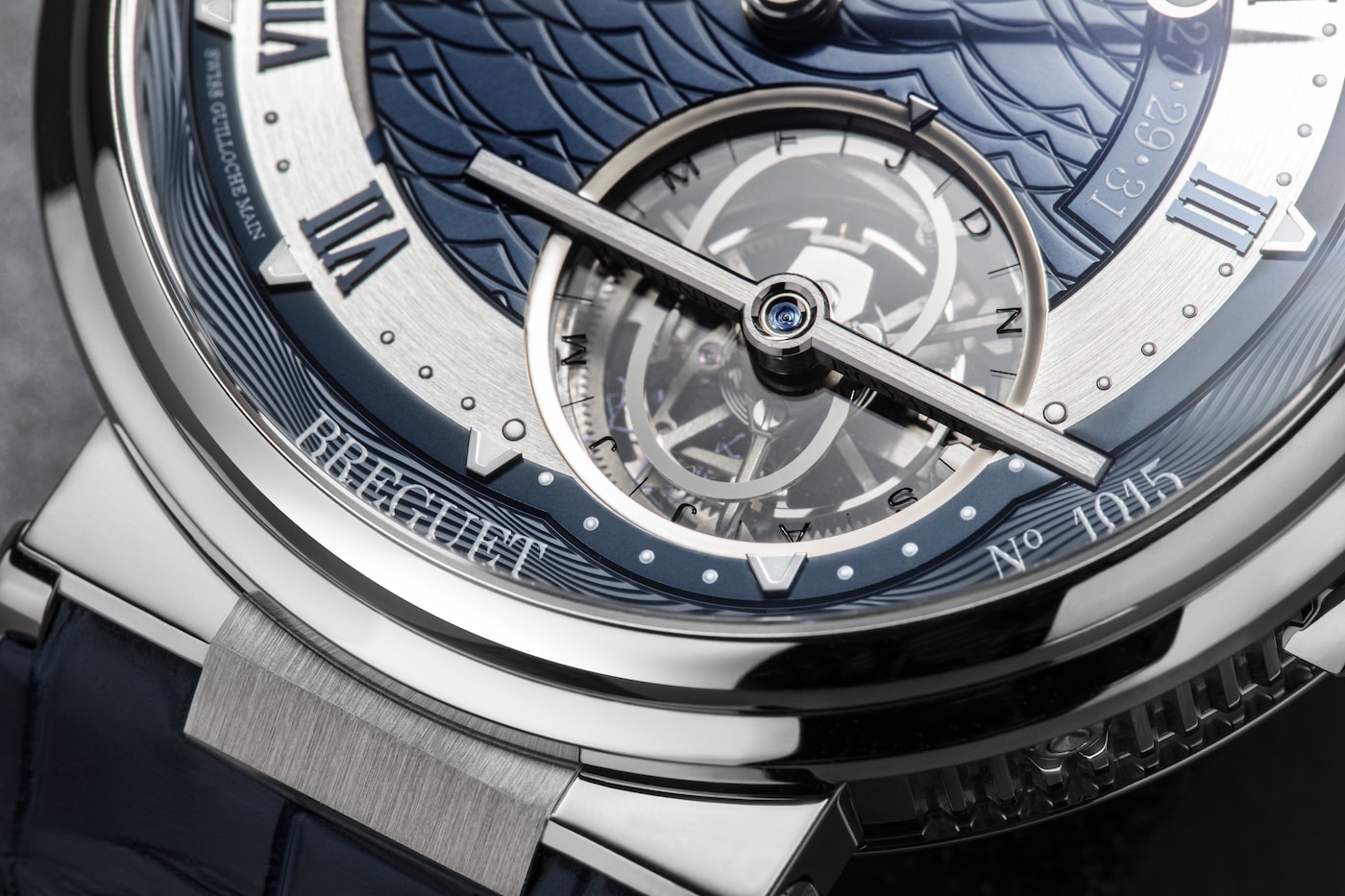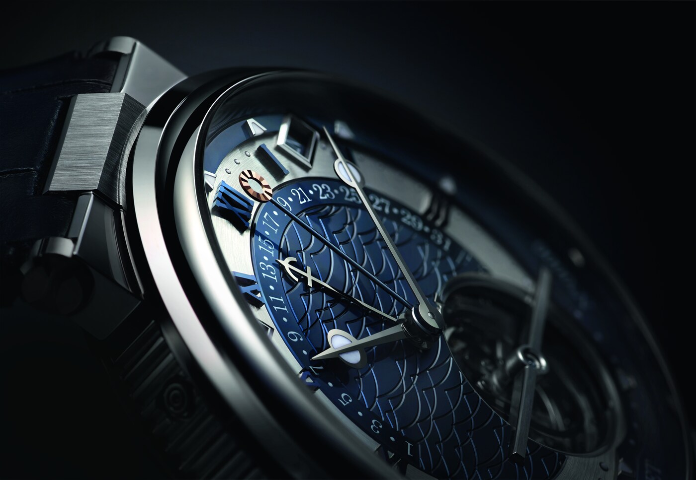 Bei 5 Uhr befindet sich ein Tourbillon. Darüber hinaus verfügt diese Uhr mit großer Komplikation auch über einen Ewigen Kalender und eine laufende Zeitgleichung.