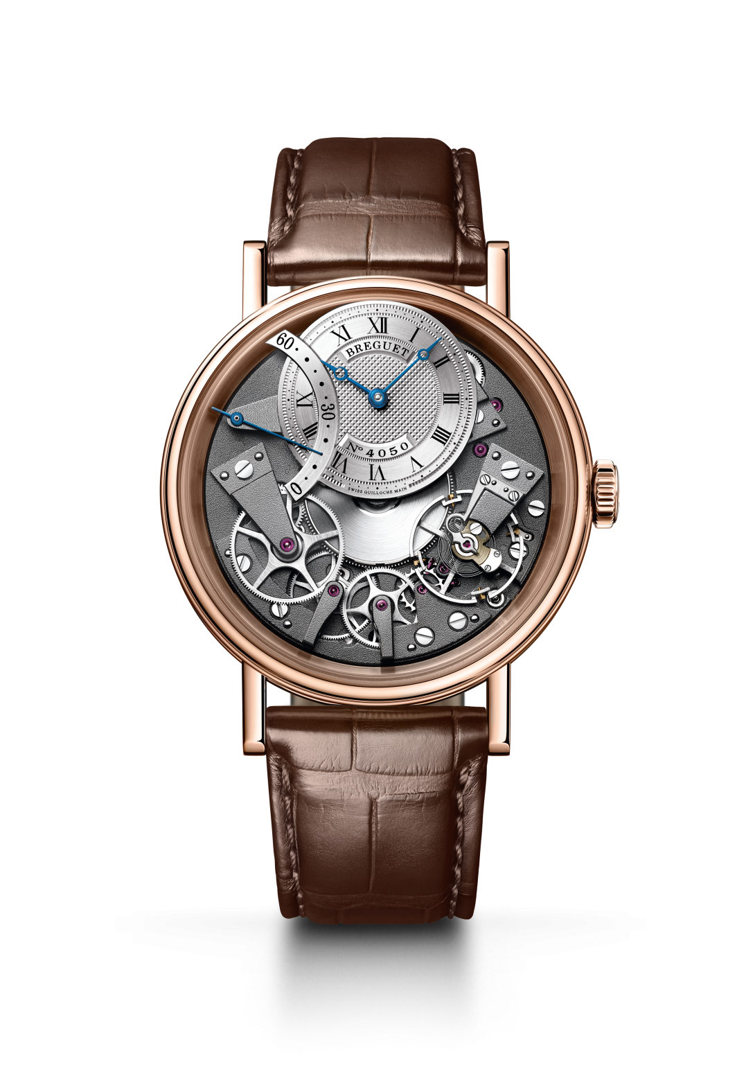 Diese symmetrische Uhr lässt keinen Zweifel an ihrer Zugehörigkeit zur Kollektion Tradition aufkommen. Die Brücken und Räder, die Hemmung, das Federhaus und andere Bestandteile des Uhrwerks, die normalerweise unter dem Zifferblatt verborgen sind, sind hier auf der Platine zu sehen. Ein weiteres starkes Element des Zeitmessers ist der „pare-chute“, eine bei 4 Uhr positionierte Stoßsicherung. Diese Erfindung von Breguet ermöglicht den Schutz der Unruhachse vor Stößen. Sie ist der Vorläufer des modernen „Incabloc“ und aller anderen Schutzvorrichtungen gegen Stöße.