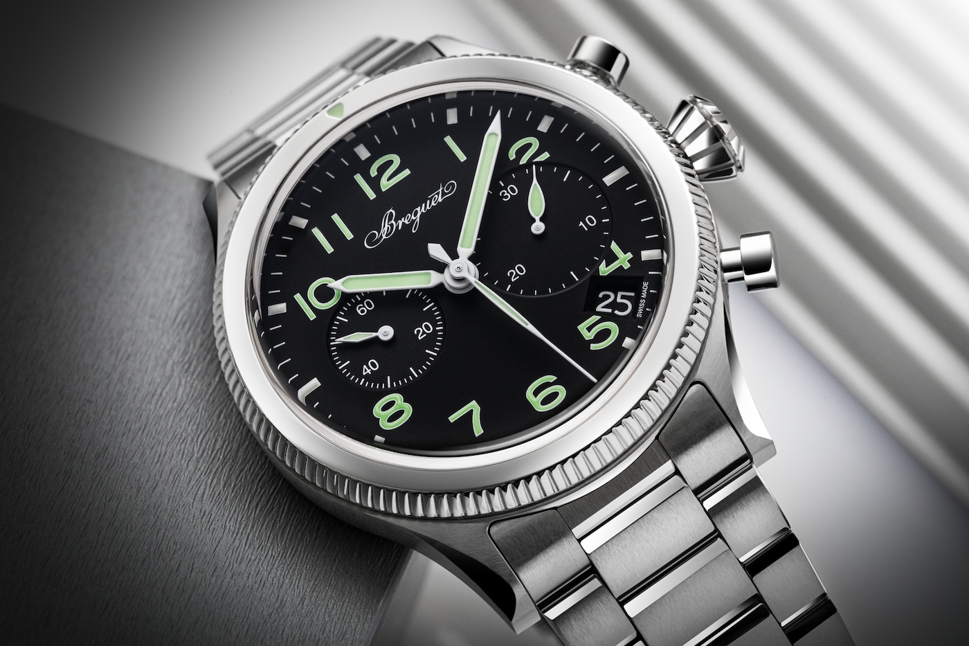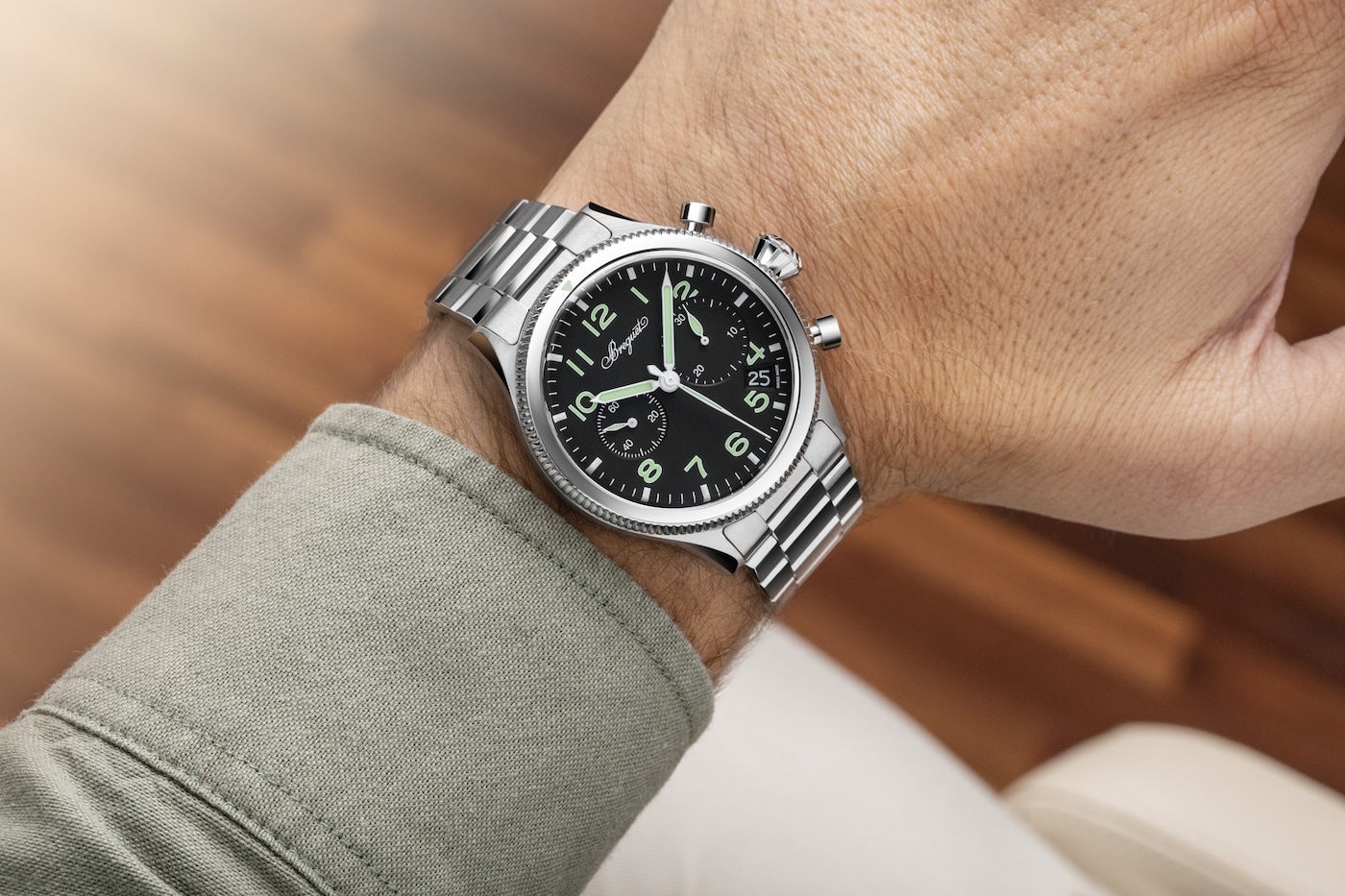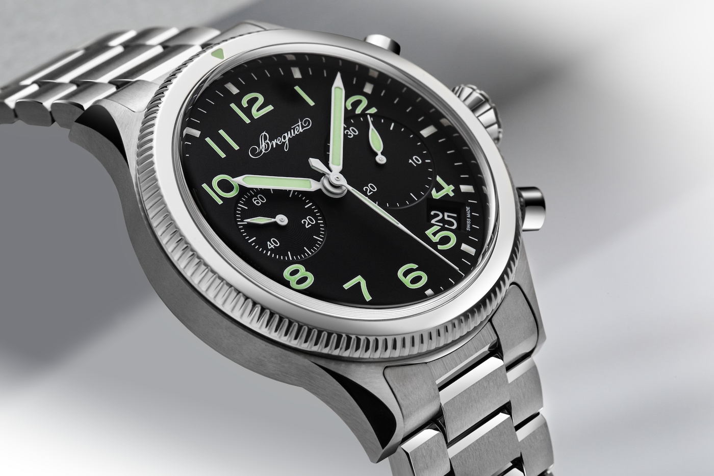 Das schwarze Zifferblatt wurde modernisiert, bleibt der Identität der Type 20 jedoch treu. Die arabischen Ziffern und das Dreieck auf der Lünette sind ebenso wie die Zeiger in Mintgrün gehalten und mit Leuchtmasse versehen. Der 30-Minuten-Zähler bei 3 Uhr ist nun größer als der 60-Sekunden-Zähler bei 9 Uhr, und bei 4:30 Uhr befindet sich ein Datumsfenster.