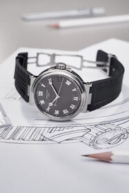 와인딩 로터는 해양 전문가들에게 ‘방향타’라고 알려진 선박의 핸들 형태를 갖추고 있으며, 갈바닉 처리된 어두운 컬러를 입혔습니다. 와인딩 로터의 모티브는 이중 디플로이언트 버클에도 반영되었습니다. 원형 클래스프에도 방향타에서 영감을 받은 형태가 보여집니다.
