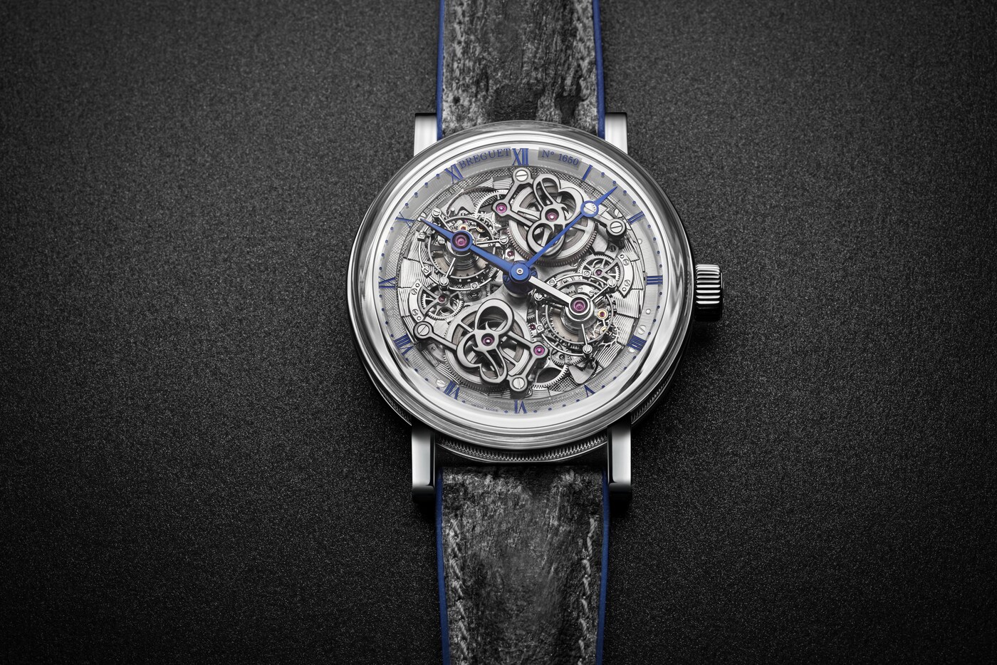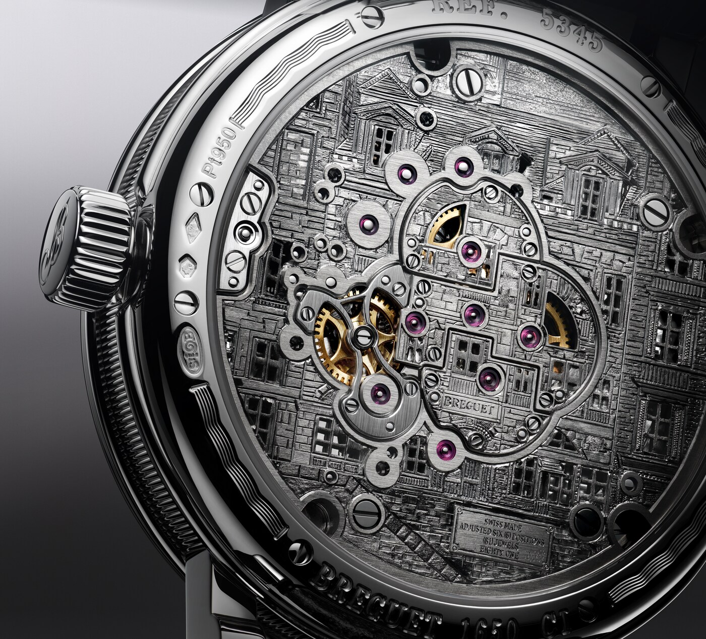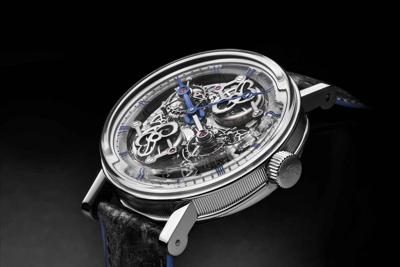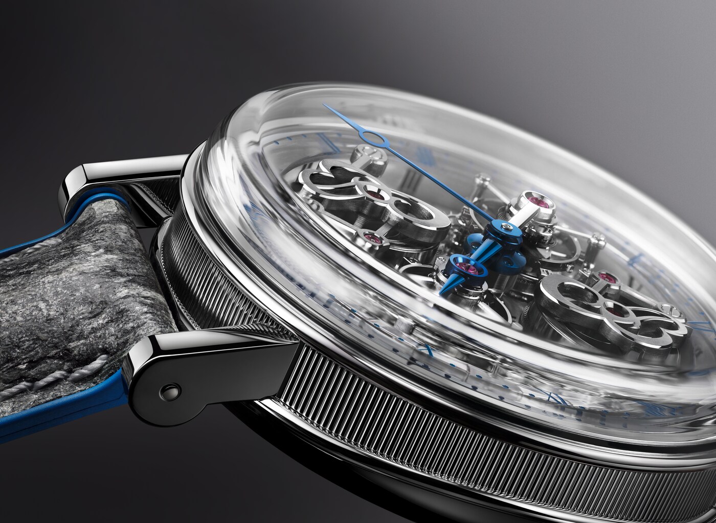 The entire mechanism, fully exposed, pivots on itself, completing a rotation in 12 hours. Each Tourbillon functions independently, making a full rotation in 1 minute. Connected together, the regulating organs perform a double revolution, powering the tourbillon bridge, which doubles as the hour hand. The mastery of the watchmaking art goes along with aesthetic virtuosity at Breguet. Each component is hand finished, while the caseback features an engraving of the Maison on the Quai de l’Horloge, the Parisian building where A.-L. Breguet carried out his work.
