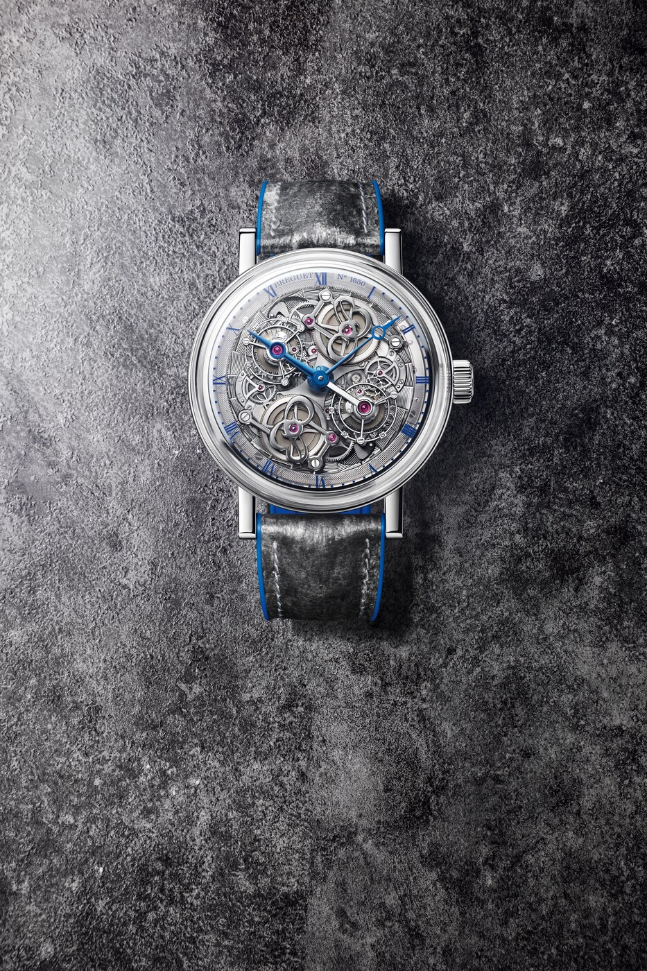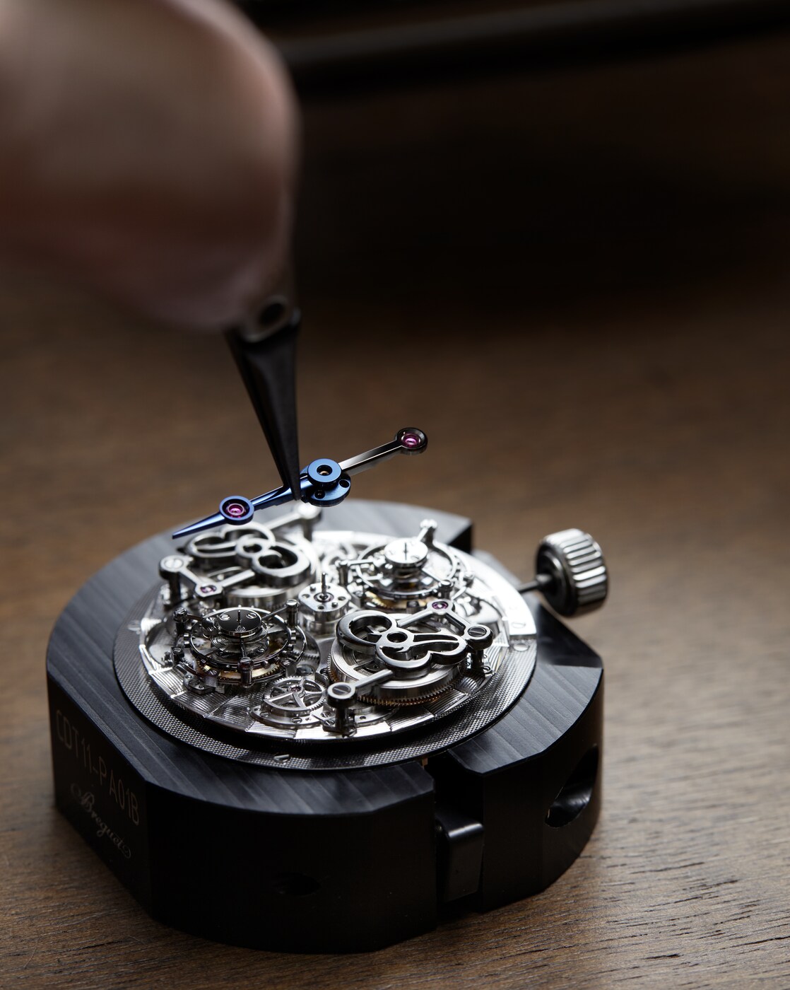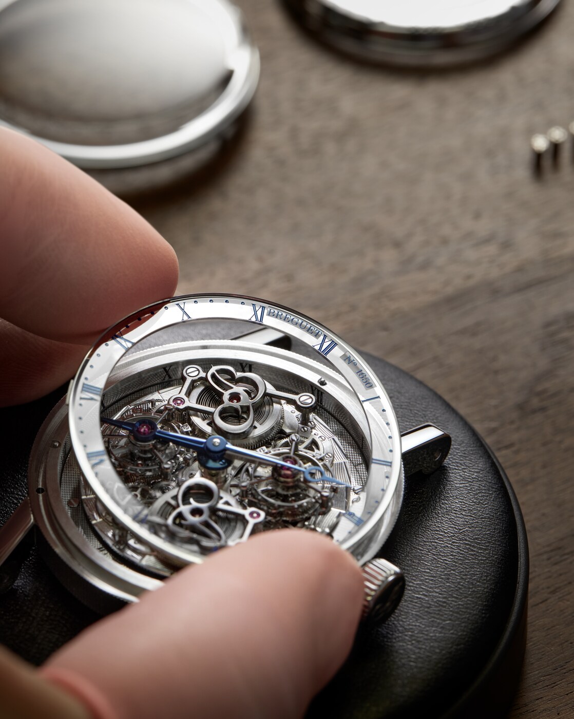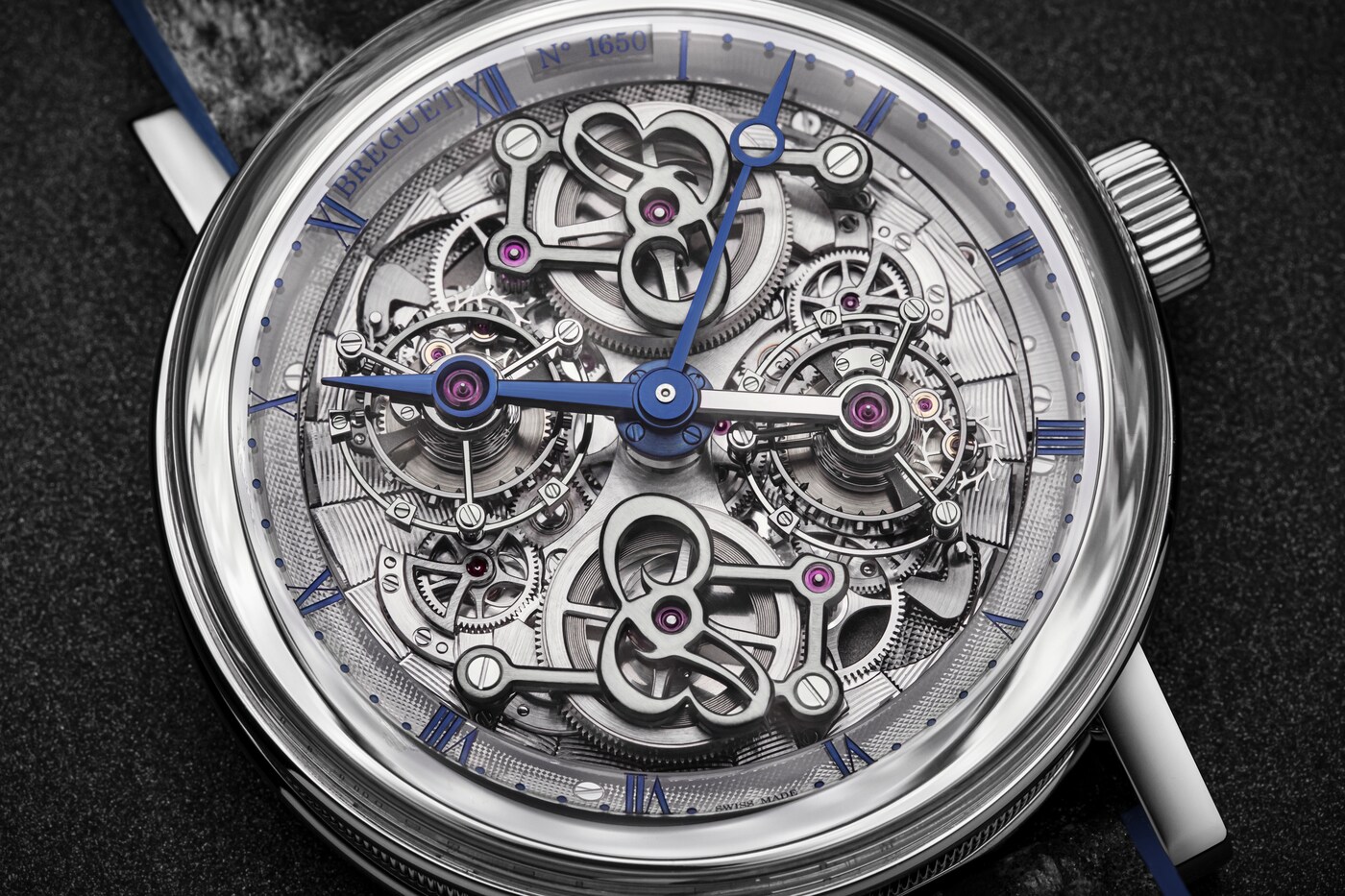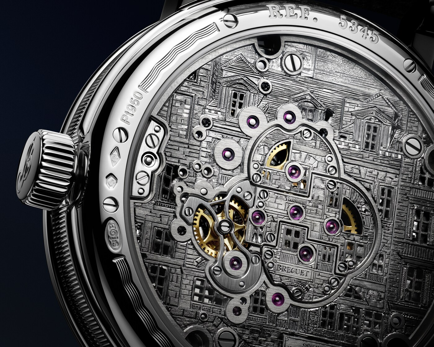 The entire mechanism, fully exposed, pivots on itself, completing a rotation in 12 hours. Each Tourbillon functions independently, making a full rotation in 1 minute. Connected together, the regulating organs perform a double revolution, powering the tourbillon bridge, which doubles as the hour hand. The mastery of the watchmaking art goes along with aesthetic virtuosity at Breguet. Each component is hand finished, while the caseback features an engraving of the Maison on the Quai de l’Horloge, the Parisian building where A.-L. Breguet carried out his work.
