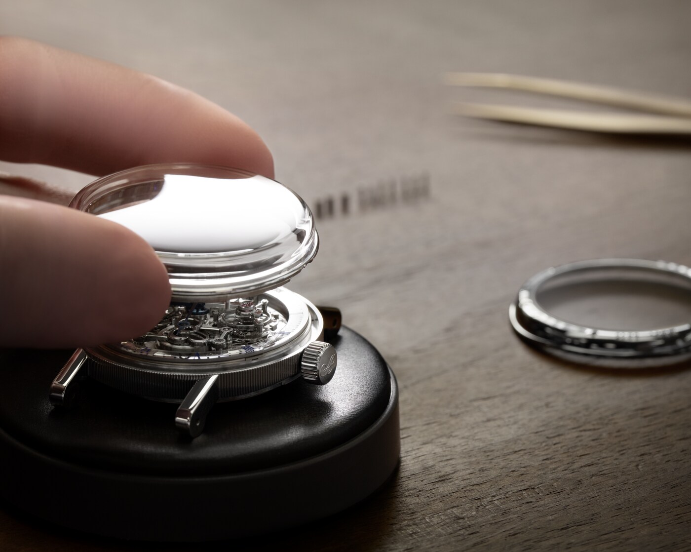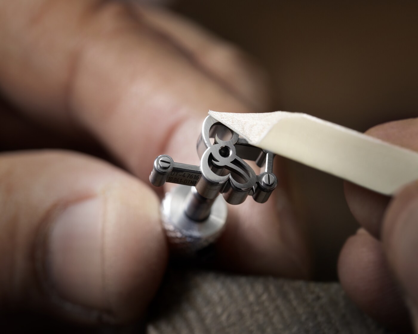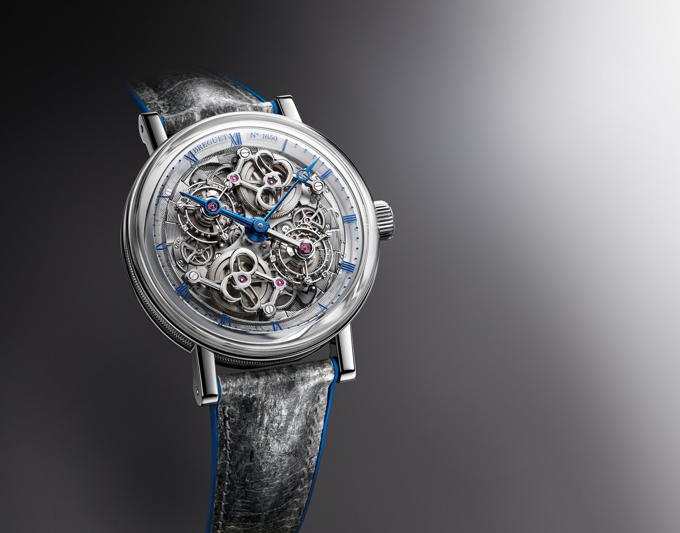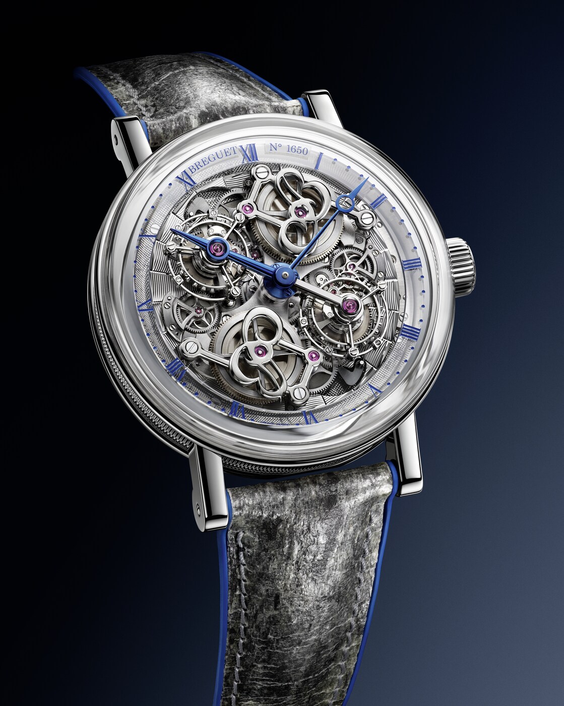 The entire mechanism, fully exposed, pivots on itself, completing a rotation in 12 hours. Each Tourbillon functions independently, making a full rotation in 1 minute. Connected together, the regulating organs perform a double revolution, powering the tourbillon bridge, which doubles as the hour hand. The mastery of the watchmaking art goes along with aesthetic virtuosity at Breguet. Each component is hand finished, while the caseback features an engraving of the Maison on the Quai de l’Horloge, the Parisian building where A.-L. Breguet carried out his work.