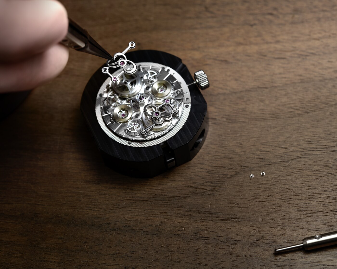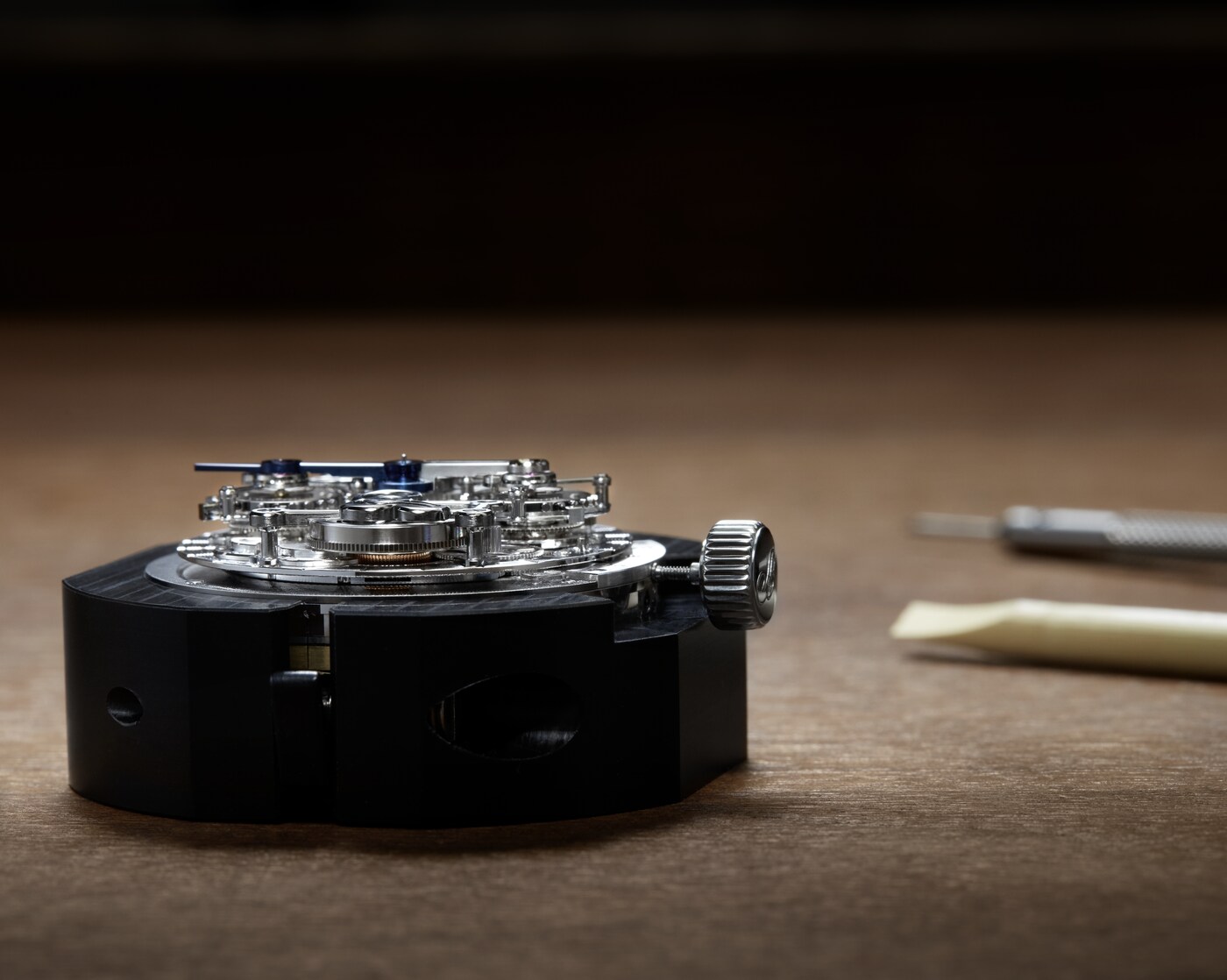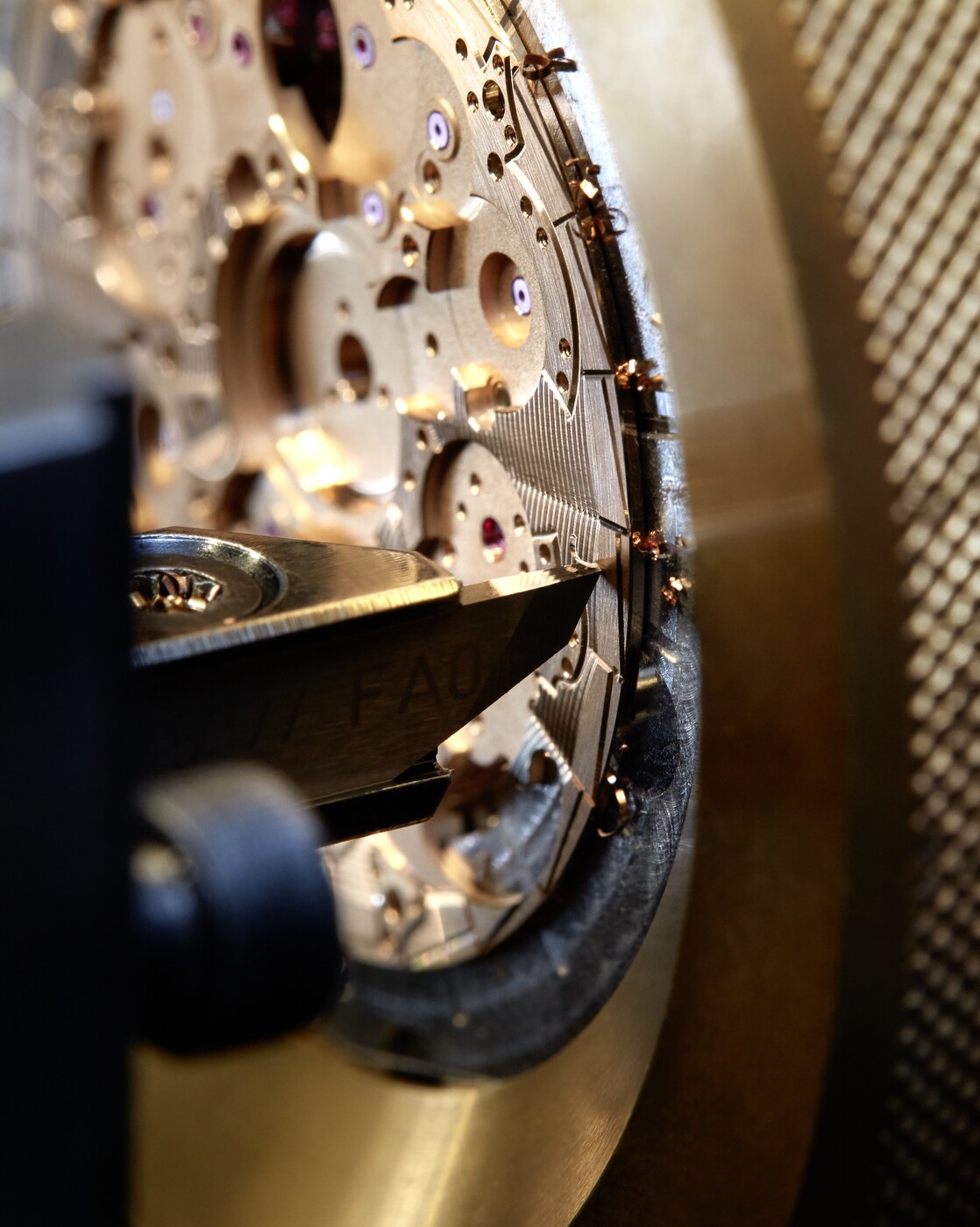 The movement of this model is made of gold and reveals two tourbillons, which set the mainplate in motion thanks to a central differential.