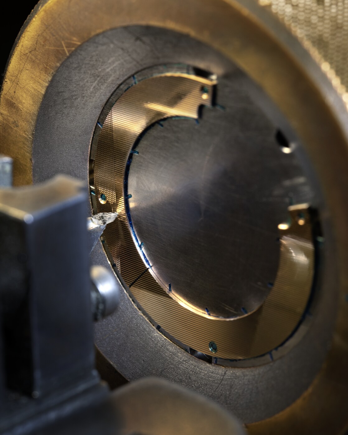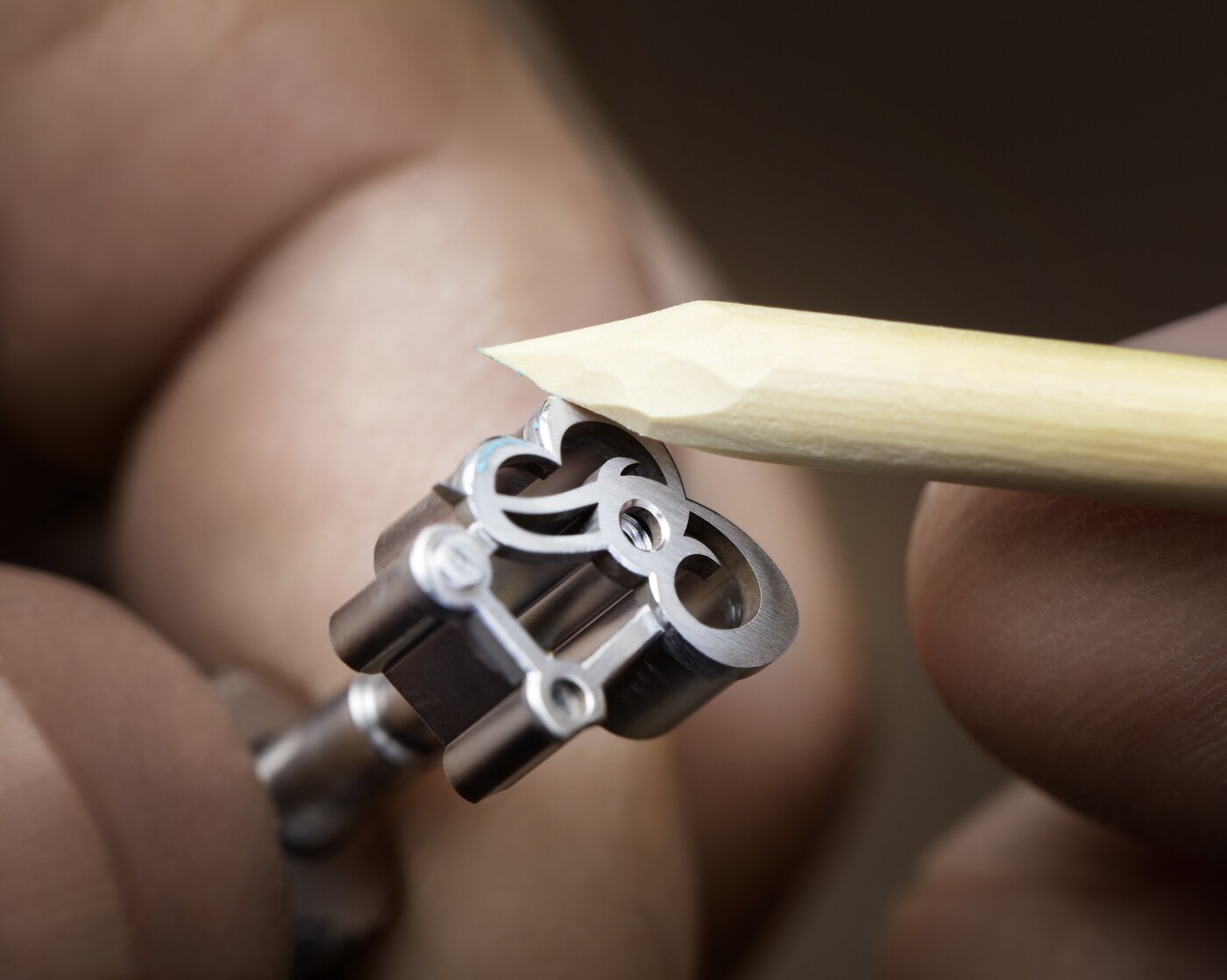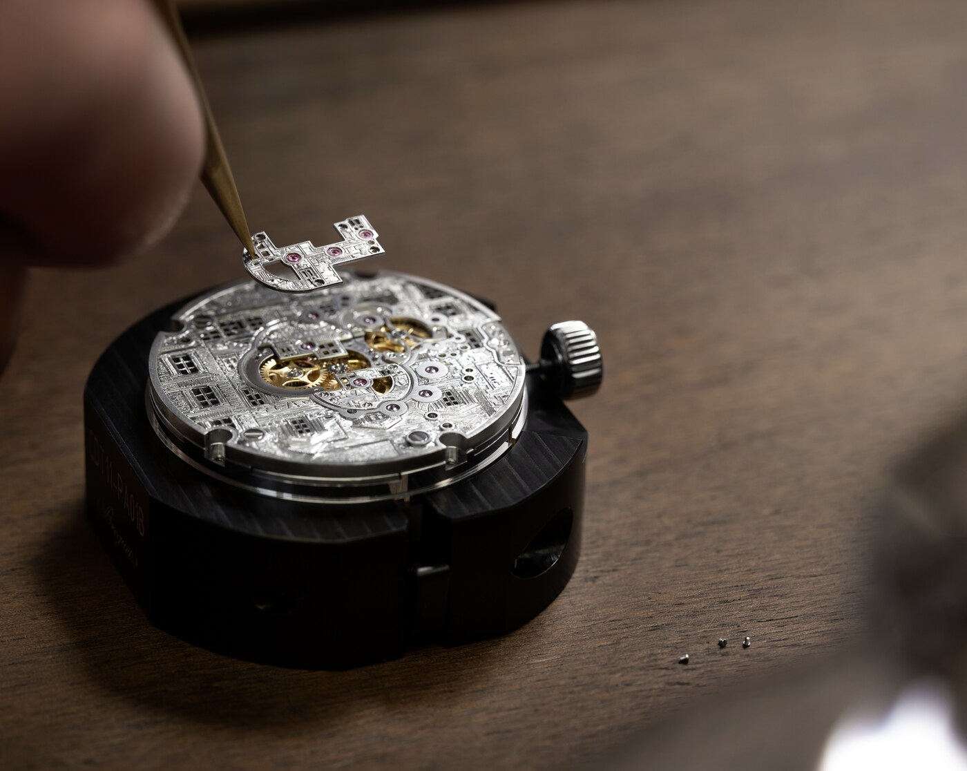 The movement of this model is made of gold and reveals two tourbillons, which set the mainplate in motion thanks to a central differential.