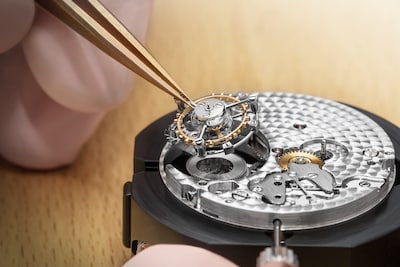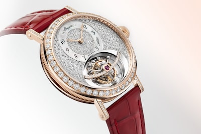 Mother-of-pearl and diamonds surround the Tourbillon housed in a large curved oval opening. The rose gold version displays the time on a natural white mother-of-pearl hours chapter, with diamonds set in the middle using the "snow-setting" technique. On the white gold model, the stars scattered over a pearled and varnished mother-of-pearl dial in midnight blue recall a starry sky. The tourbillon shaft, meanwhile, evokes a shooting star made up of snow-set diamonds.