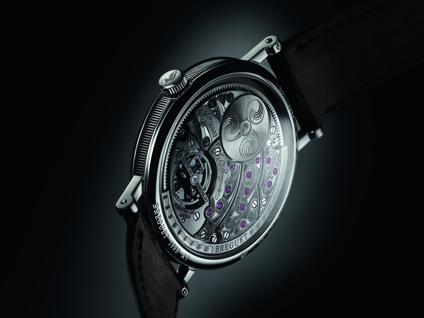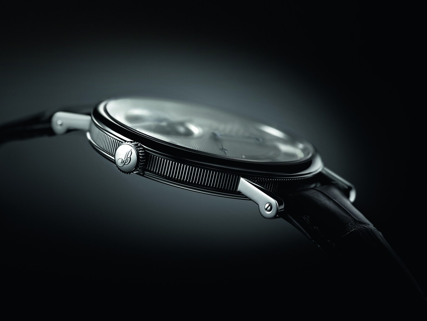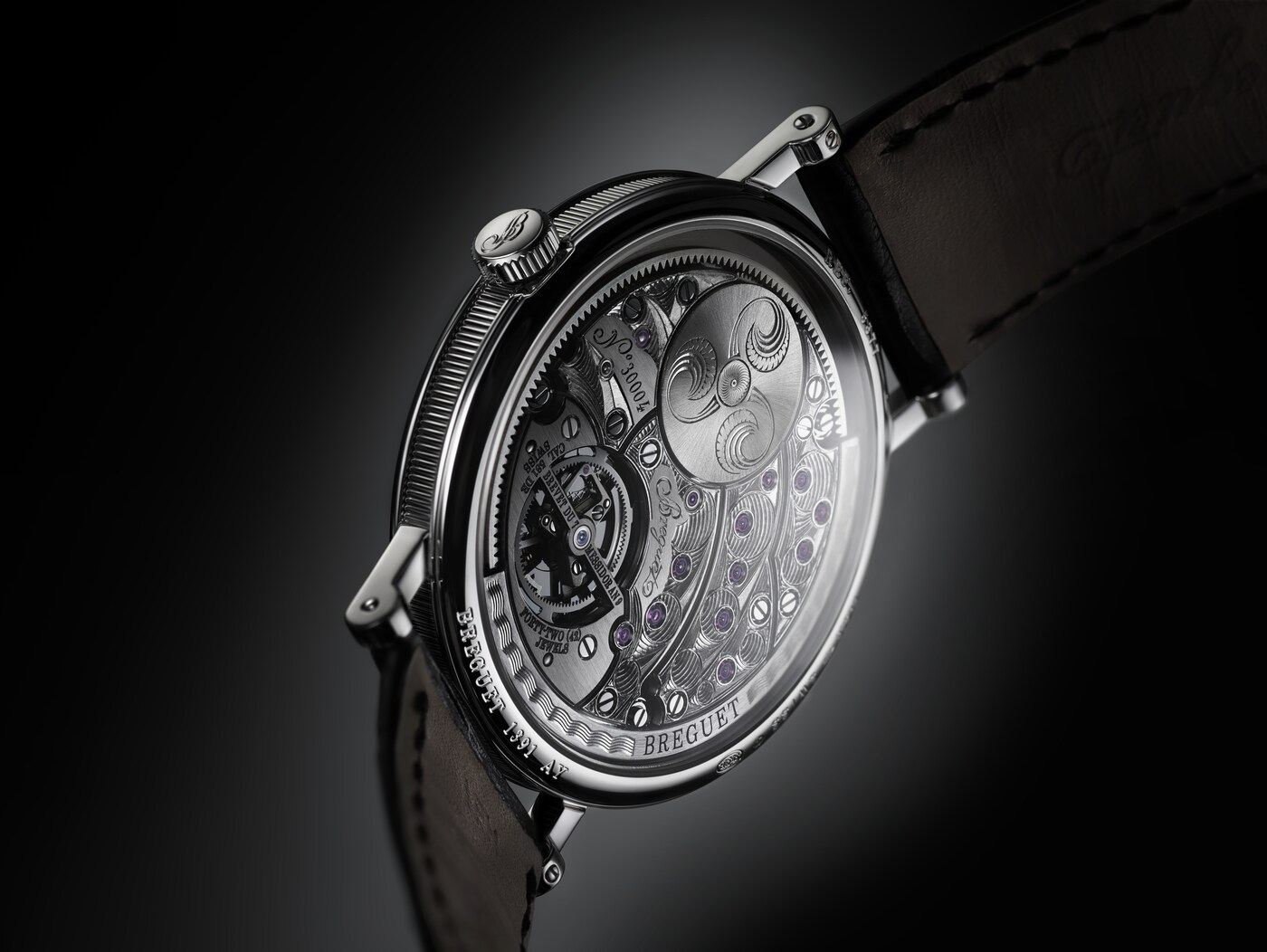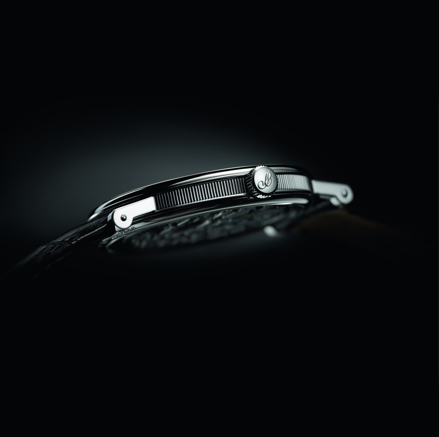 The off-centred tourbillon has a light titanium cage that carrys a Breguet silicon balance spring. Moreover, the escapement has been created especially for this piece. These technical characteristics enable the balance spring to reach a frequency of 4 Hz, a high frequency for a Tourbillon balance spring. However, the power reserve has not been sacrificed, thanks to the patented high-energy barrel. The model 5377 has a power reserve of 80 hours. To be able to fit a 3 mm movement in a 7.1 mm case, Breguet developed a platinum oscillating weight located on the periphery of the calibre.