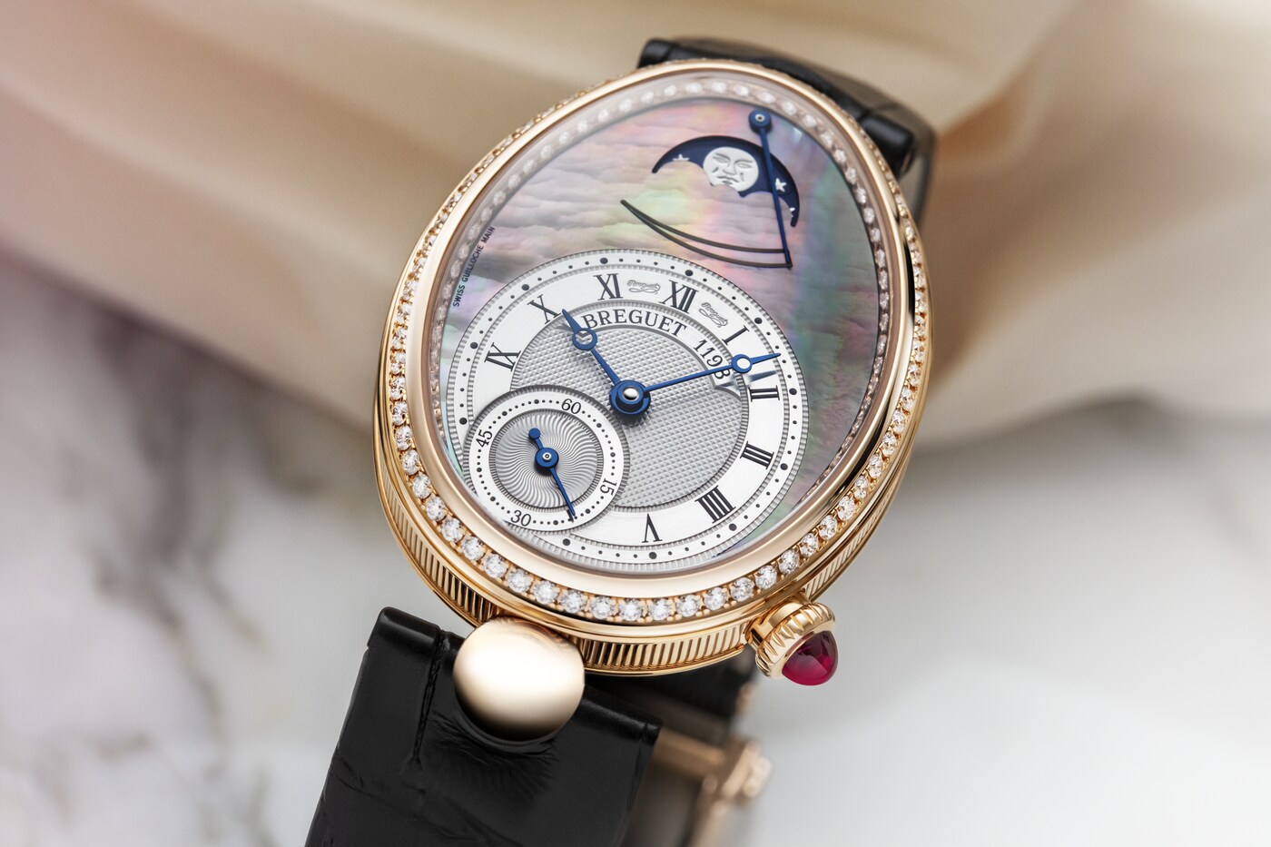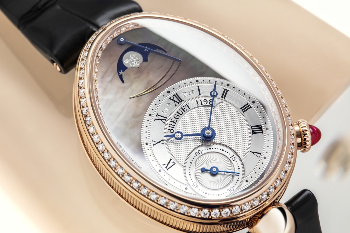 This watch revives the main features of the first watch designed to be worn on the wrist, namely the moon phases and power reserve indicator.