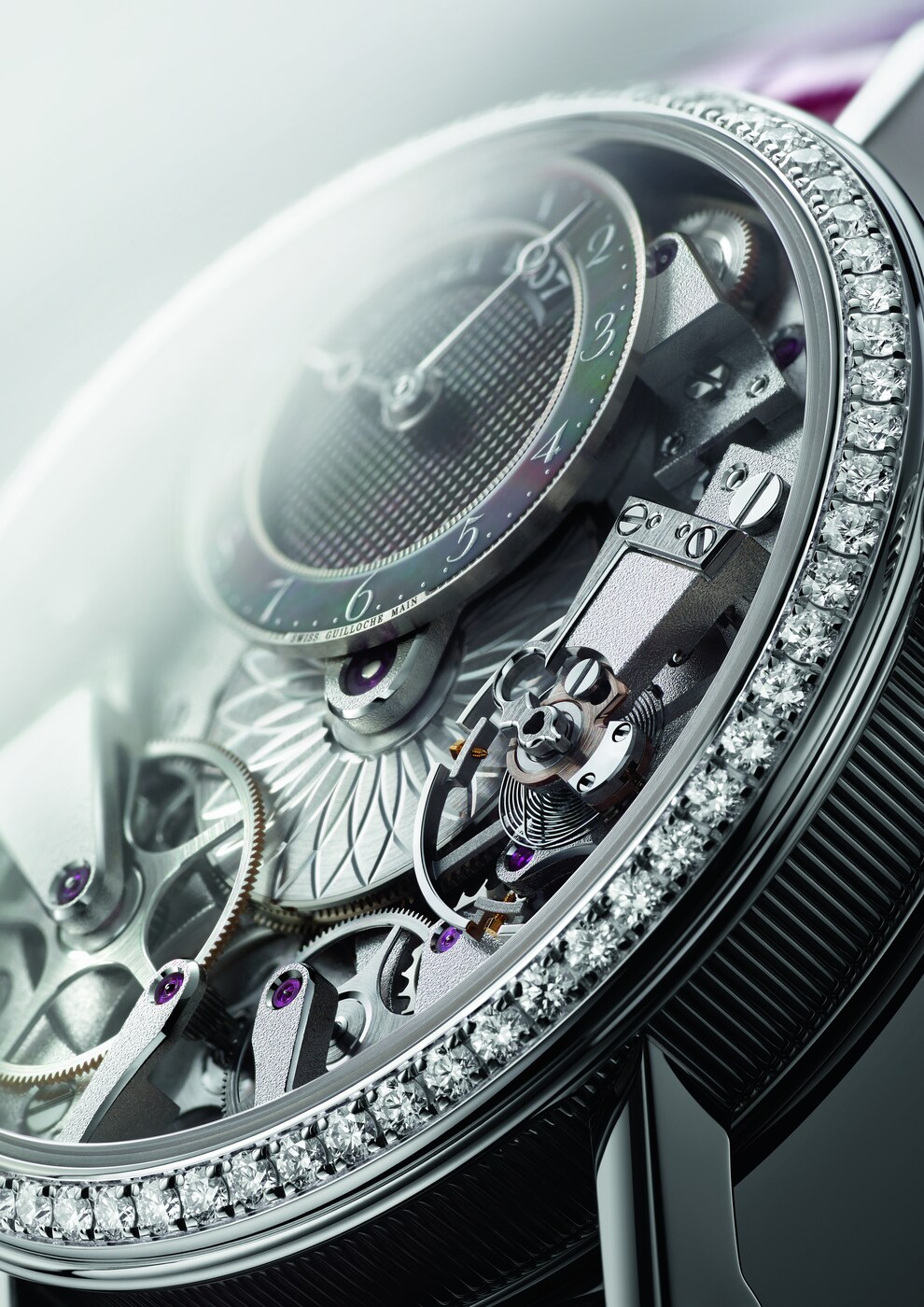 A small mother-of-pearl dial reveals the central barrel decorated with a rosette motif. This motif is repeated on the oscillating weight, which is visible through a sapphire caseback. The bezel and the strap buckle of this model are adorned with brilliant-cut diamonds, while a jewel decorates the crown.