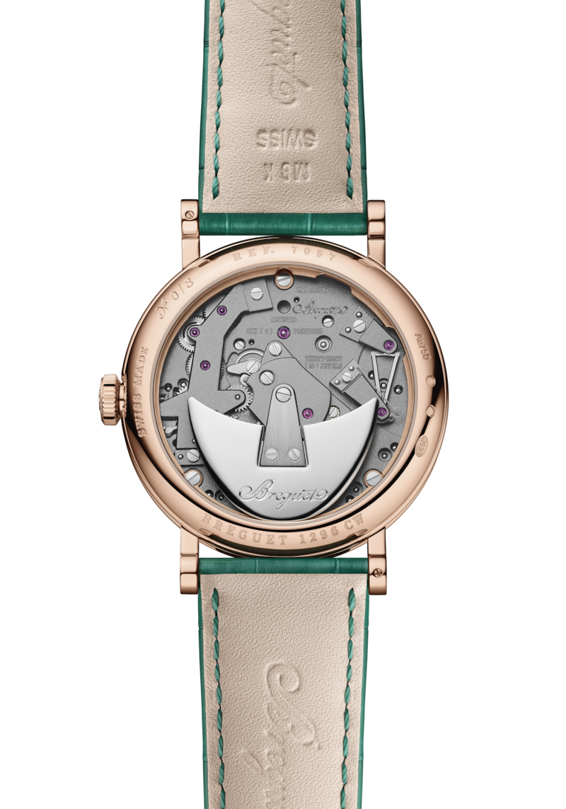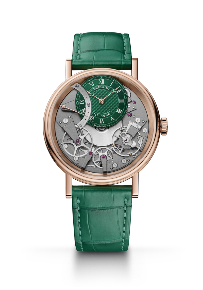 Entirely symmetrical, this watch leaves no doubt that it belongs to the Tradition collection. The bridges, wheels, escapement, barrel and other components of the movement, usually hidden beneath the dial, are here exposed on the main plate. Another highlight of the timepiece is the pare-chute located at 4 o’clock. This Breguet invention protects the pivots of the balance wheel from impact. It is the forerunner of the modern “Incabloc” and all other shock protection mechanisms.