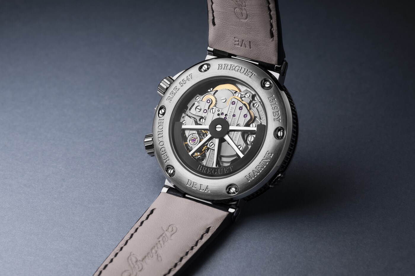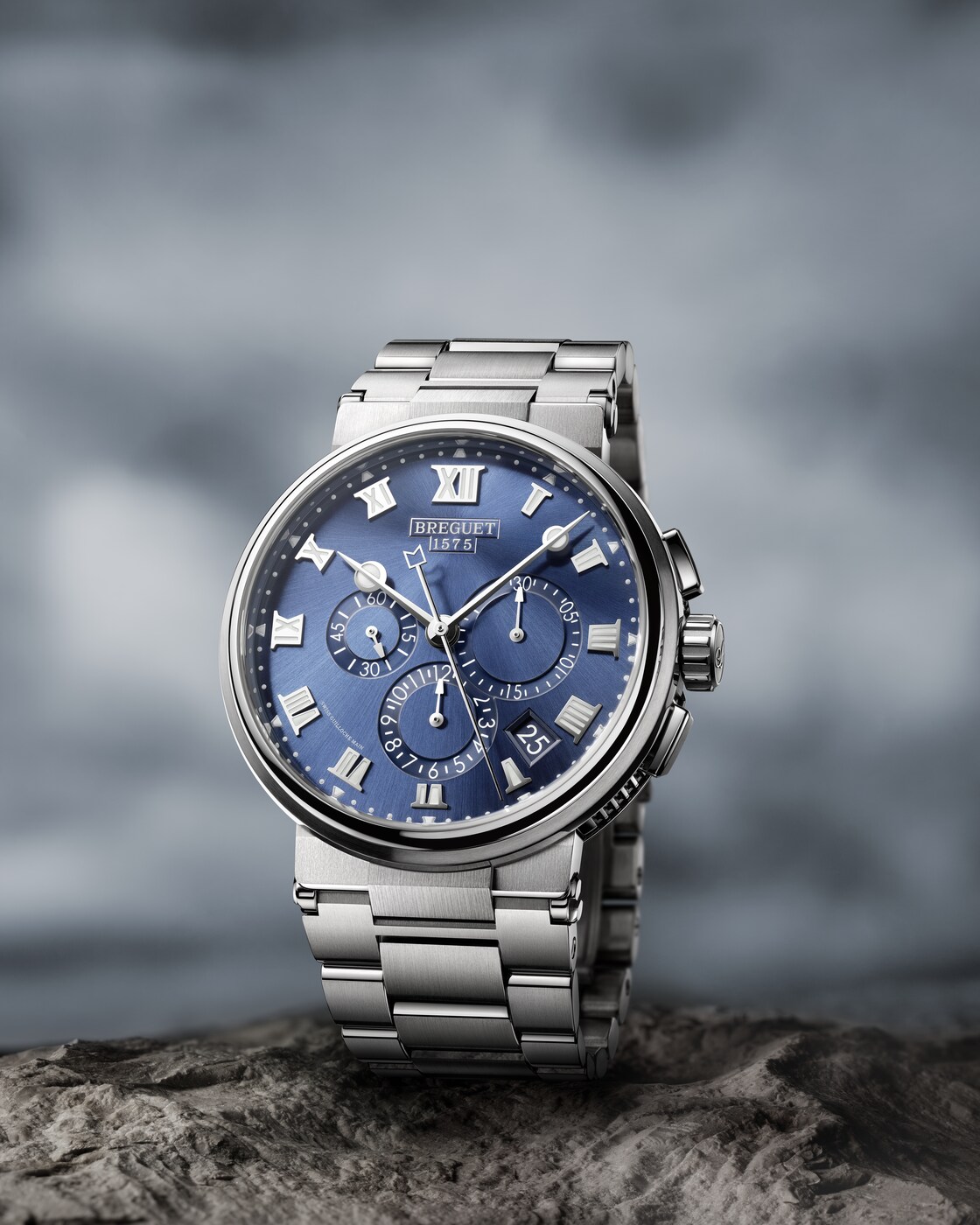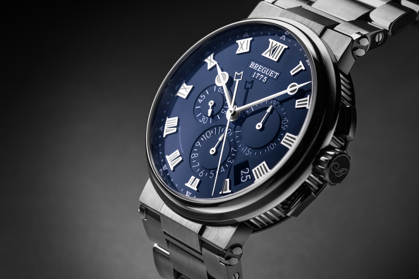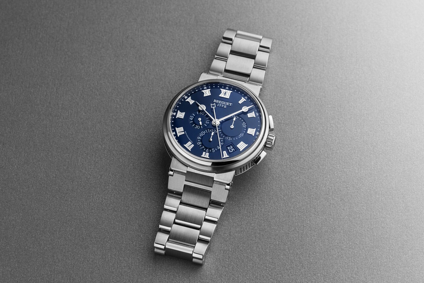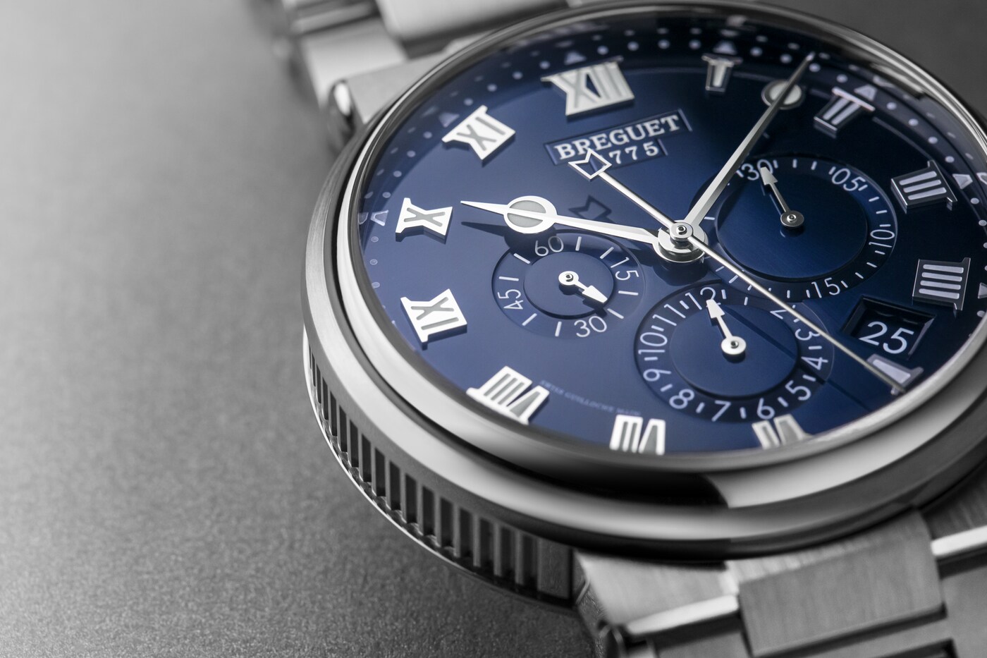 Tres contadores situados entre las 3 horas y las 9 horas muestran los minutos cronometrados, las horas y el segundero pequeño. Mientras que la aguja del cronógrafo se identifica por un sutil detalle marino, la hora puede leerse gracias a las inconfundibles agujas Breguet. Al igual que los números y los marcadores, estas son luminiscentes, lo que facilita la lectura de la hora incluso en condiciones de poca luz.