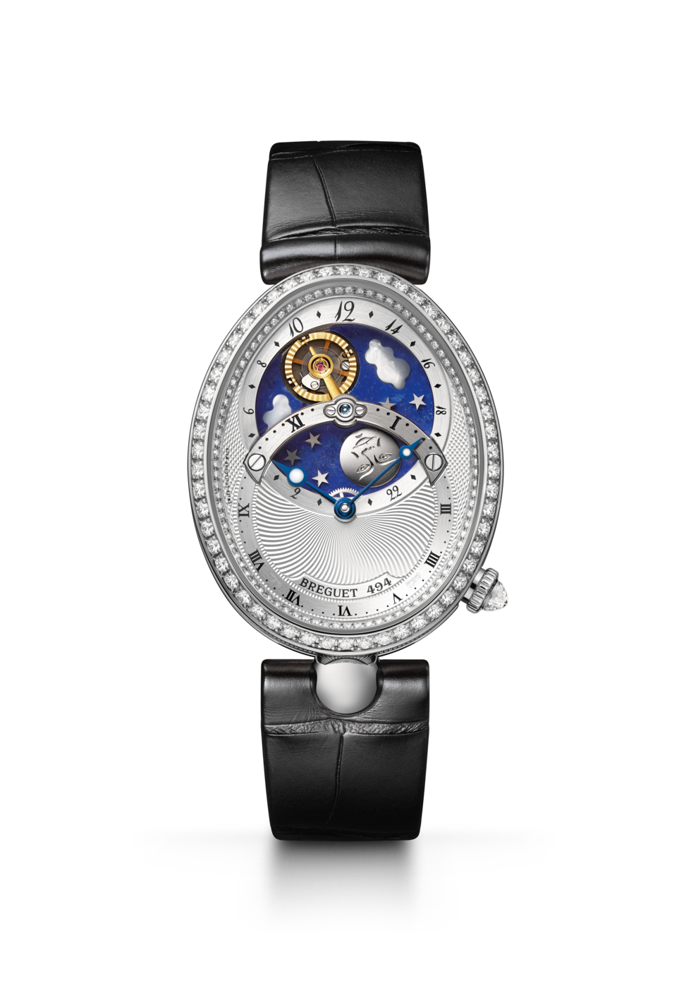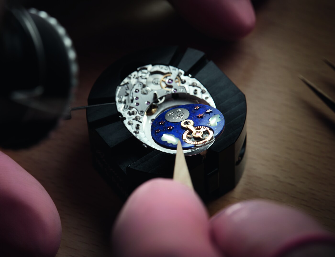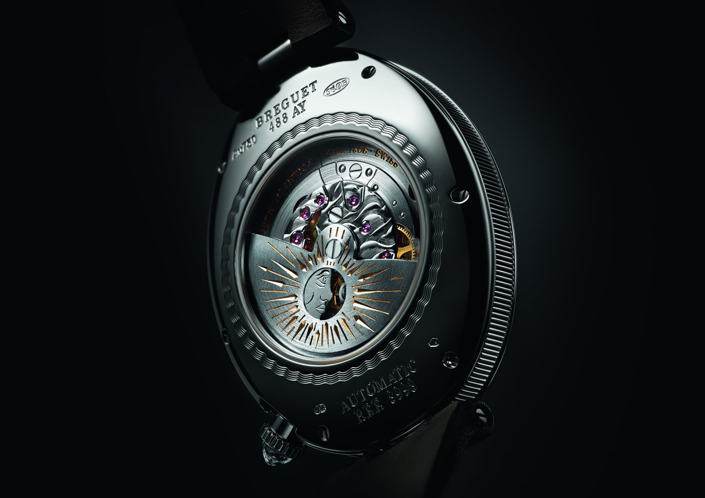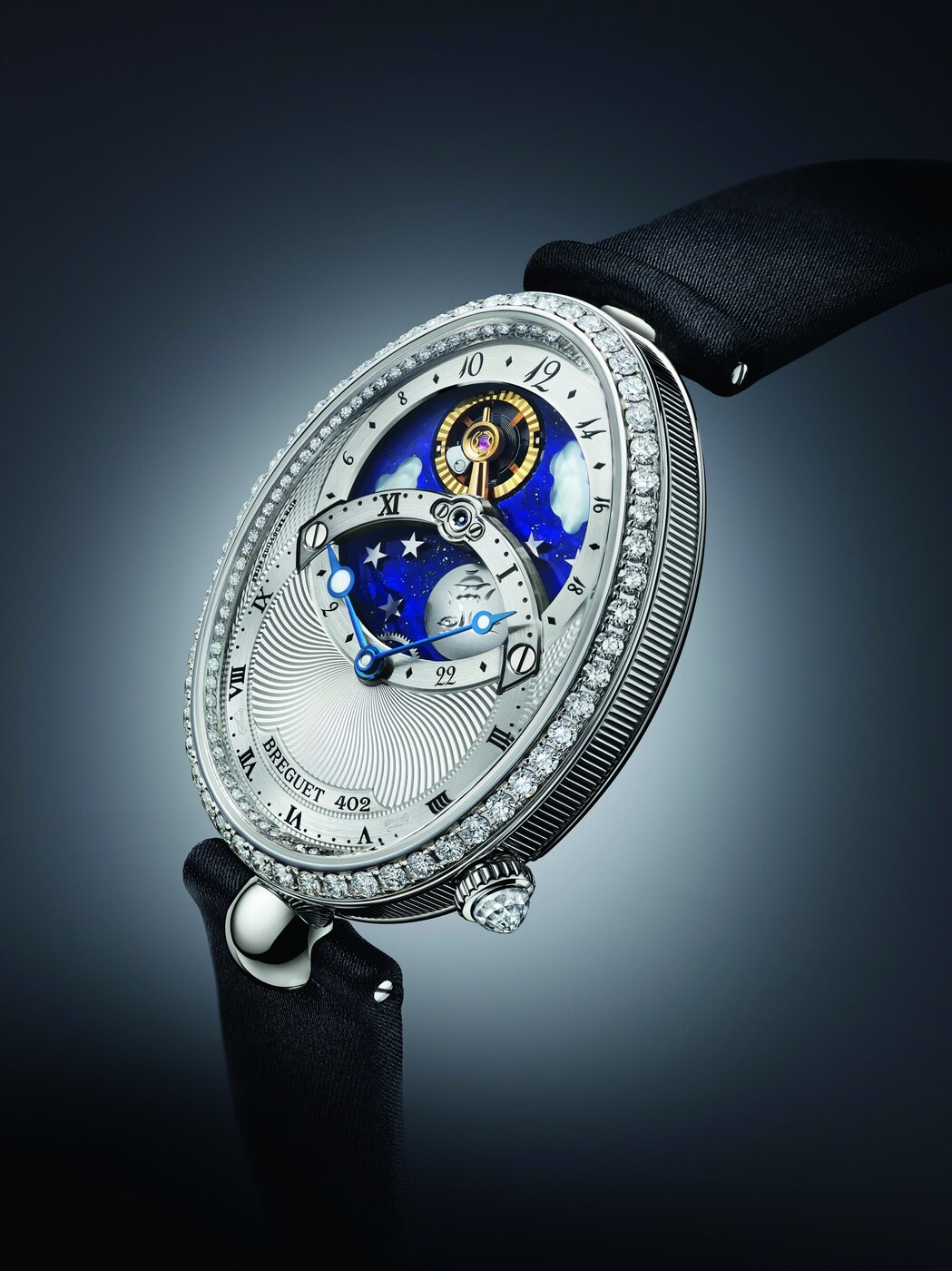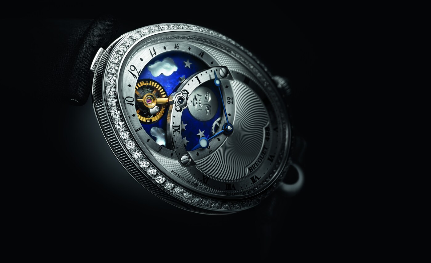 El movimiento patentado de este modelo presenta una indicación con 2 esferas, una que muestra las horas y los minutos de forma tradicional, y la segunda con la complicación que indica las horas del día y de la noche. El cielo está representado por un disco de lapislázuli con incrustaciones de nubes de nácar blanco natural, estrellas de oro y una luna de titanio grabada a mano. Sin embargo, la verdadera estrella es el sol, representado por el aro del volante facetado que evoca los rayos solares. Completa una rotación en un día, pasando por debajo del puente de acero que sostiene el mecanismo y siempre frente a la luna.