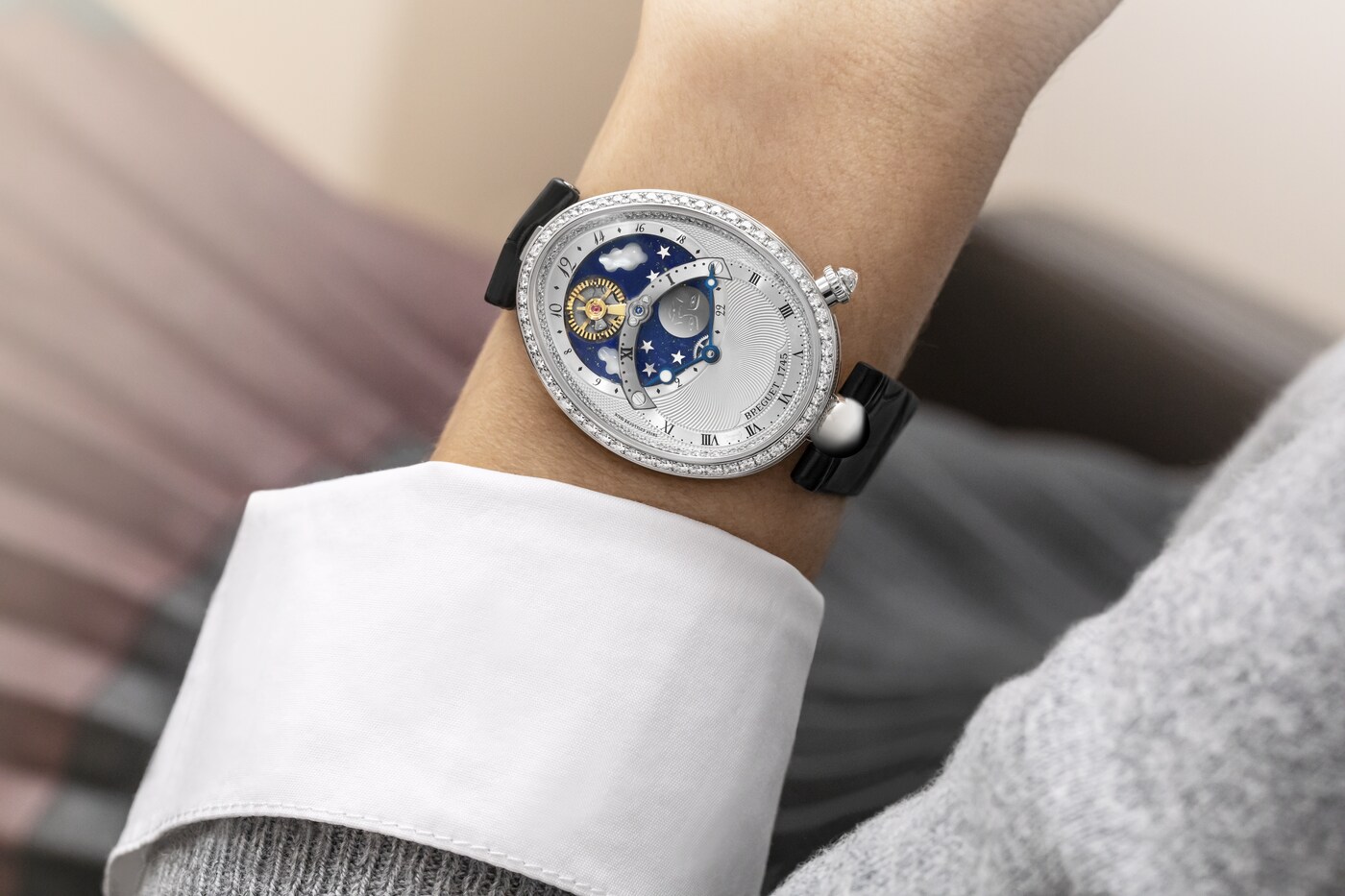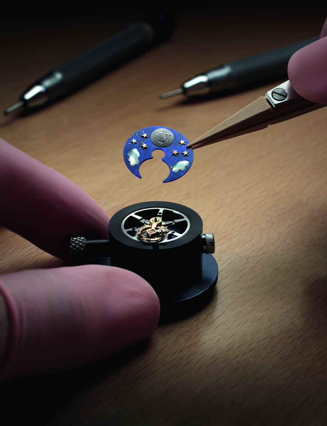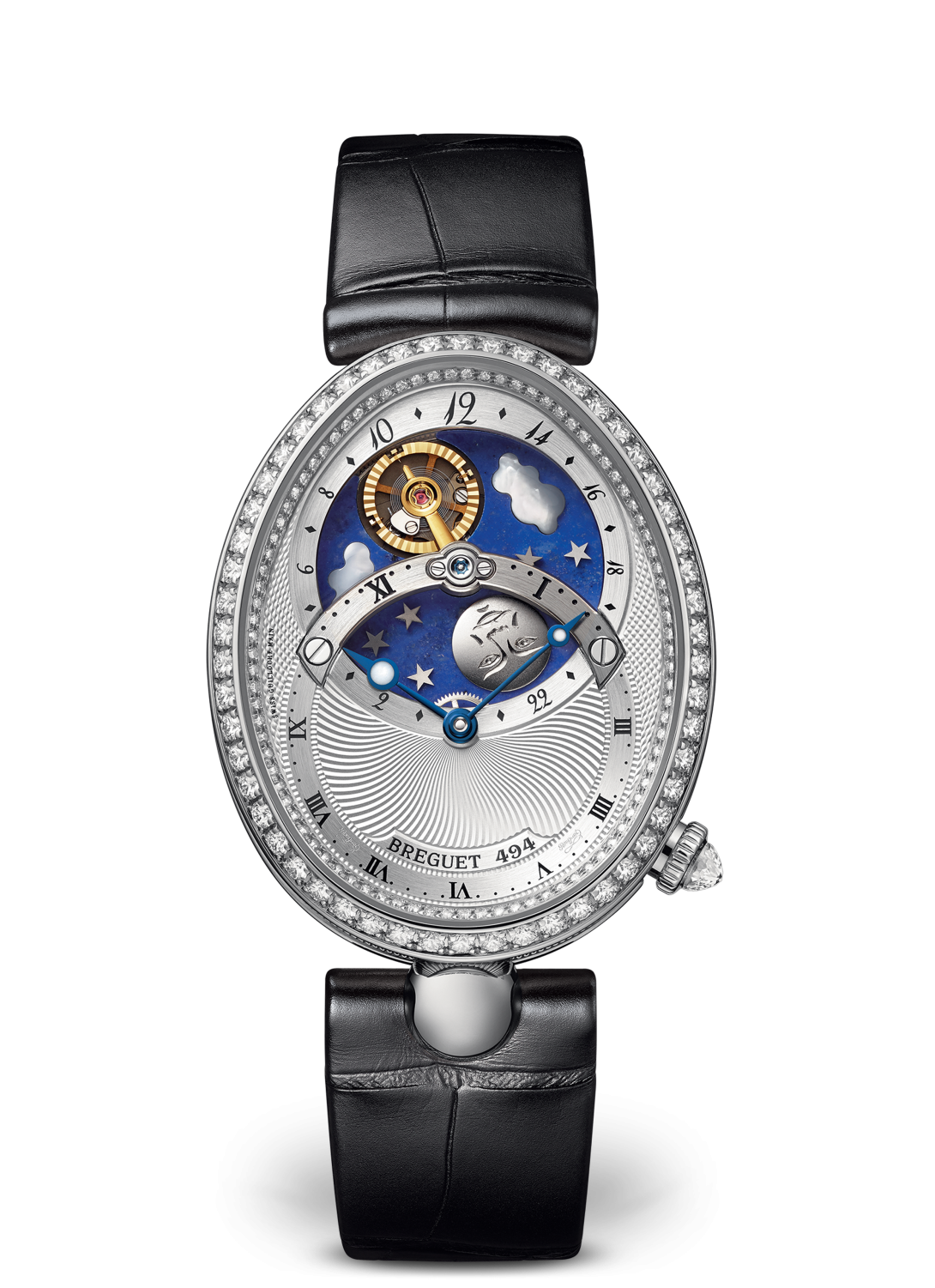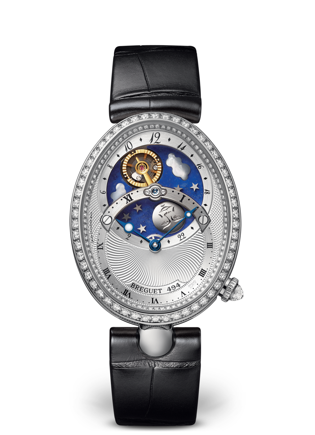 El movimiento patentado de este modelo presenta una indicación con 2 esferas, una que muestra las horas y los minutos de forma tradicional, y la segunda con la complicación que indica las horas del día y de la noche. El cielo está representado por un disco de lapislázuli con incrustaciones de nubes de nácar blanco natural, estrellas de oro y una luna de titanio grabada a mano. Sin embargo, la verdadera estrella es el sol, representado por el aro del volante facetado que evoca los rayos solares. Completa una rotación en un día, pasando por debajo del puente de acero que sostiene el mecanismo y siempre frente a la luna.