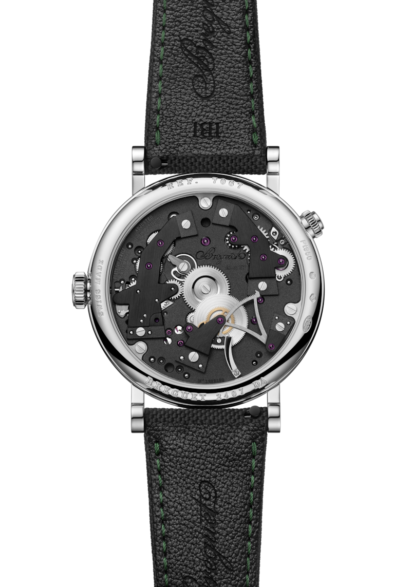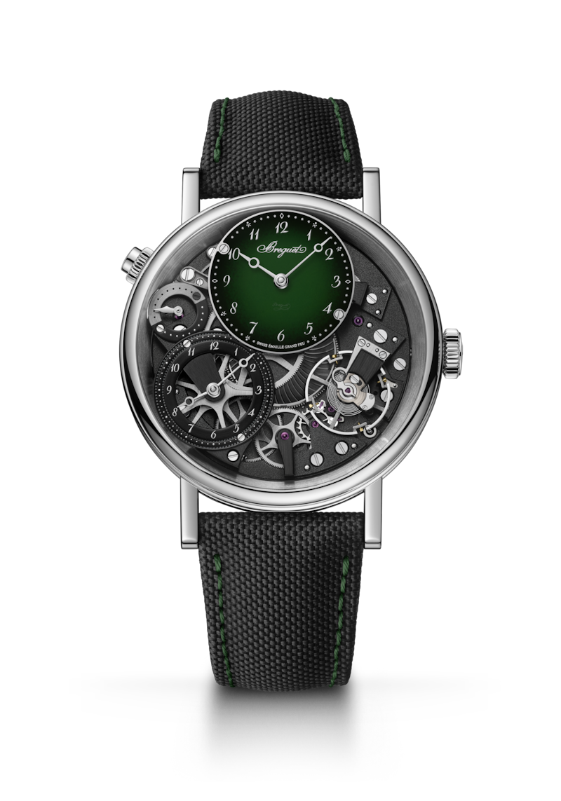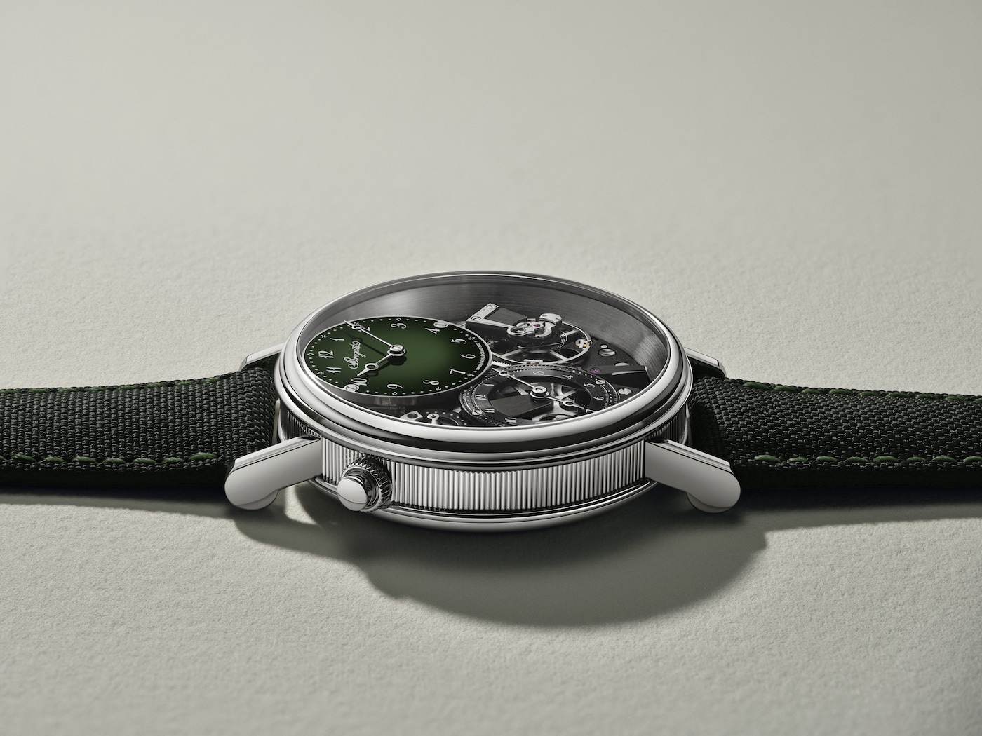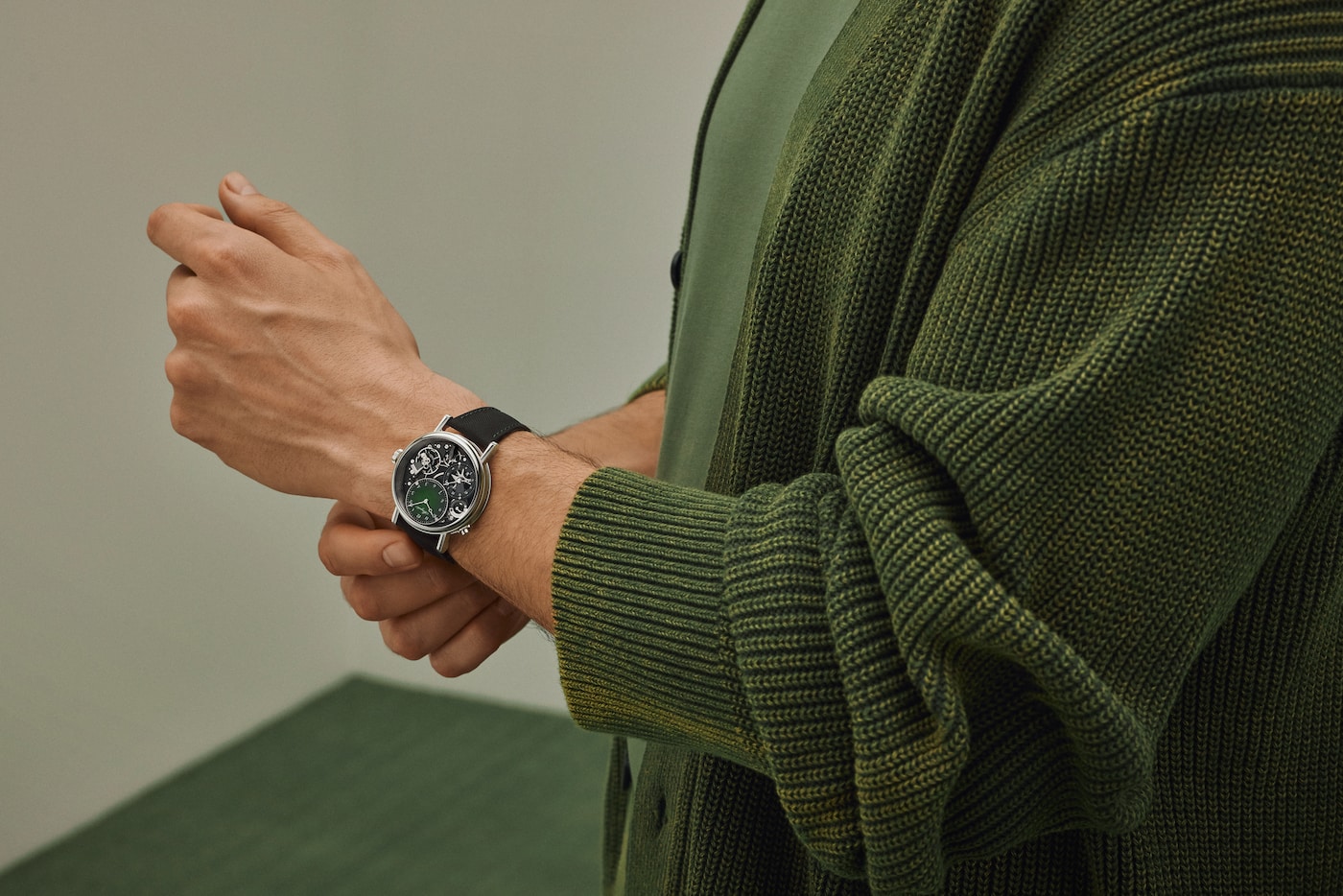 La elegancia de su diseño se corresponde con su sencillez de uso: un pulsador situado en el canto a las 10 horas permite corregir rápidamente el huso horario, que puede leerse en la esfera descentrada a las 12 horas. Una segunda esfera con decoración guilloché realizada a mano y descentrada a las 8 horas muestra la hora de referencia con su indicador día/noche, identificable a las 10 horas por su alternancia de color plateado y negro.