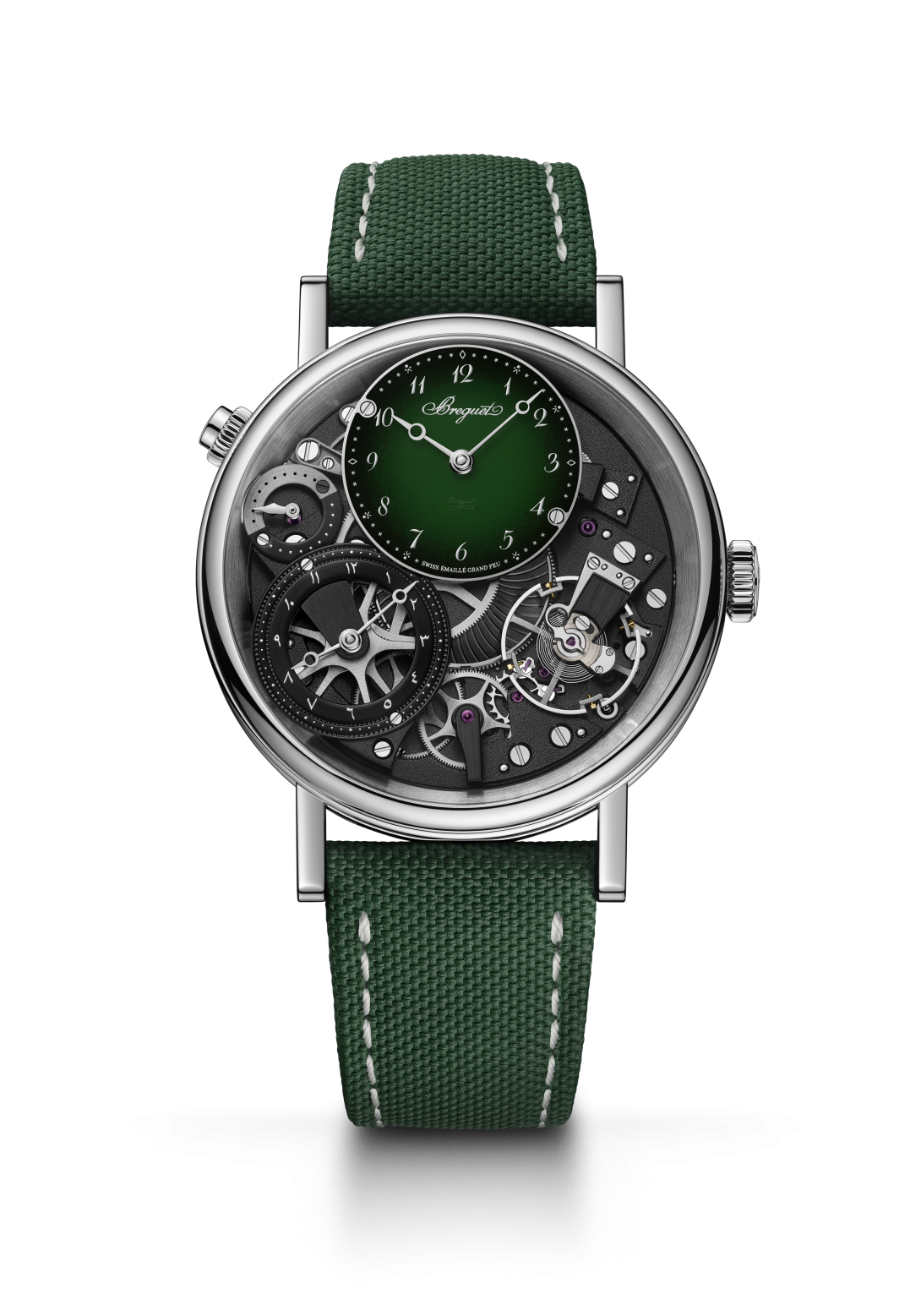 La elegancia de su diseño se corresponde con su sencillez de uso: un pulsador situado en el canto a las 10 horas permite corregir rápidamente el huso horario, que puede leerse en la esfera descentrada a las 12 horas. Una segunda esfera con decoración guilloché realizada a mano y descentrada a las 8 horas muestra la hora de referencia con su indicador día/noche, identificable a las 10 horas por su alternancia de color plateado y negro.
