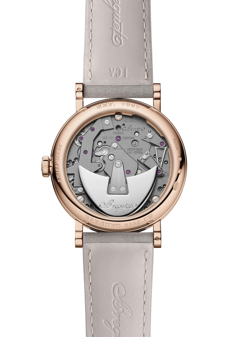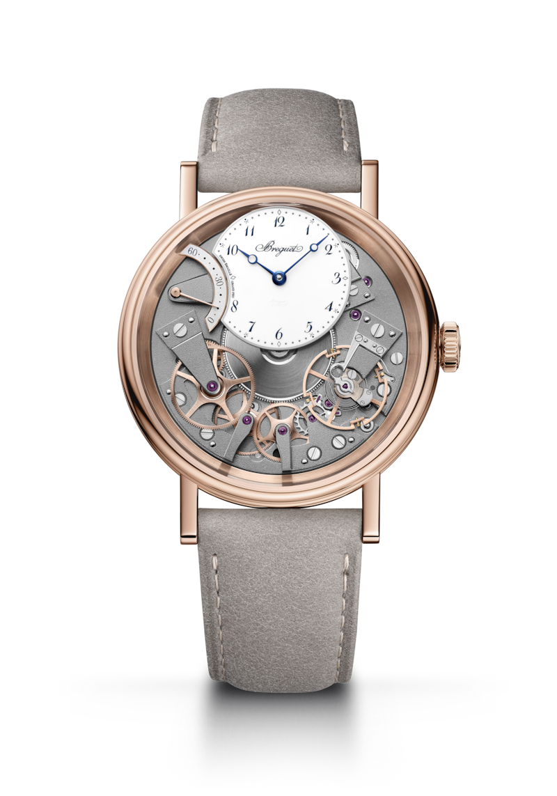 La simetría de este reloj no deja lugar a dudas de que pertenece a la colección Tradition. Los puentes, las ruedas, el escape, el barrilete y otros componentes del movimiento, normalmente ocultos bajo la esfera, quedan aquí expuestos en la platina. Otra característica clave de este reloj es el paracaídas situado a las 4 horas. Esta invención Breguet protege el eje del volante de los golpes. Es el precursor del moderno "Incabloc" y de todos los demás sistemas de protección contra impactos.