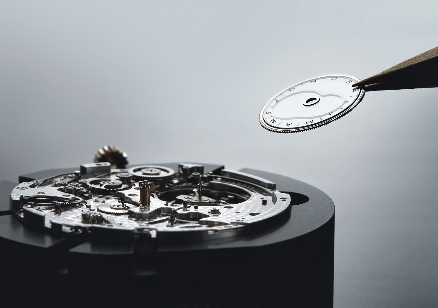 Une masse oscillante périphérique en platine décorée d’un motif « vagues » cintre le dos ciselé main du calibre 581DPE pour faire apparaître la silhouette du Royal Louis, un navire de guerre de la Marine Royale mis en service dès 1752. Le barillet, quant à lui, est décoré d'une rose des vents gravée main. Le guillochage et la gravure sont des arts délicats, exécutés à la main par des artisans d'exception, véritables maîtres dans leur domaine. Chaque motif est patiemment sculpté, chaque ligne est tracée avec une précision infinie, insufflant à chaque montre un caractère unique, presque vivant. Ces pièces deviennent bien plus que de simples montres : elles capturent l'essence du temps et l’âme de l’artisan, offrant un luxe rare, celui de porter une œuvre d’art, exclusive et inimitable.
