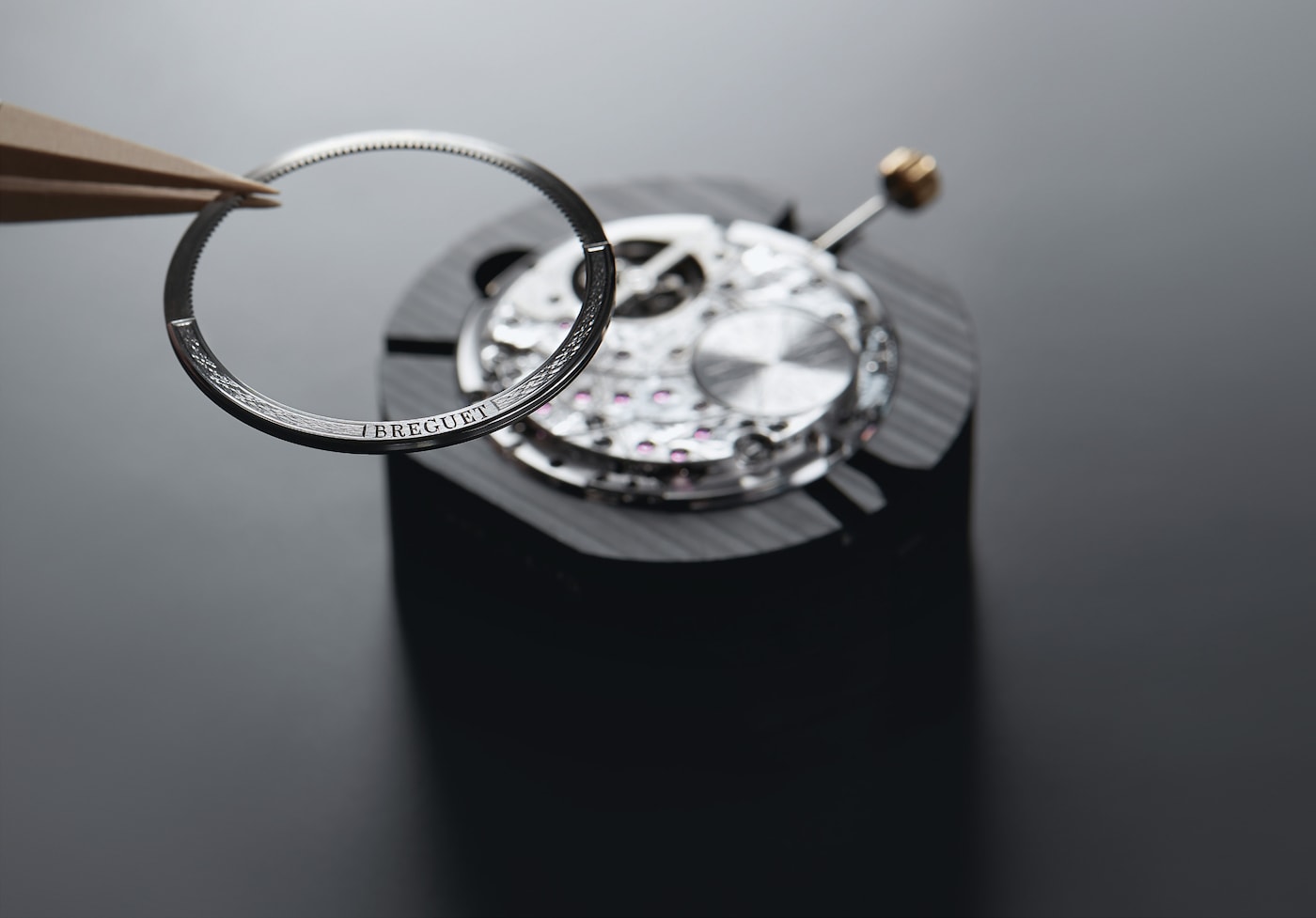 Cette œuvre d'Abraham-Louis Breguet, brevetée en 1801 pour contrer les effets néfastes de la gravité sur la marche des mouvements mécaniques alors logés dans des montres de poche, installe vers 5h sa cage en titane et son balancier Breguet à spiral en silicium.
