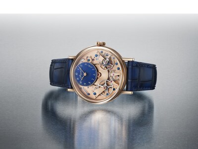 L’or Breguet, alliage exclusif présenté à l’occasion du 250e anniversaire, vient désormais habiller le boîtier de la Tradition 7035. Cette exécution solaire met en évidence l’architecture du mouvement tout en volume. L’affichage principal des heures et minutes se lit sur un cadran guilloché en émail grand feu translucide bleu. Une seconde rétrograde est positionnée entre 10 h et 11 h.
