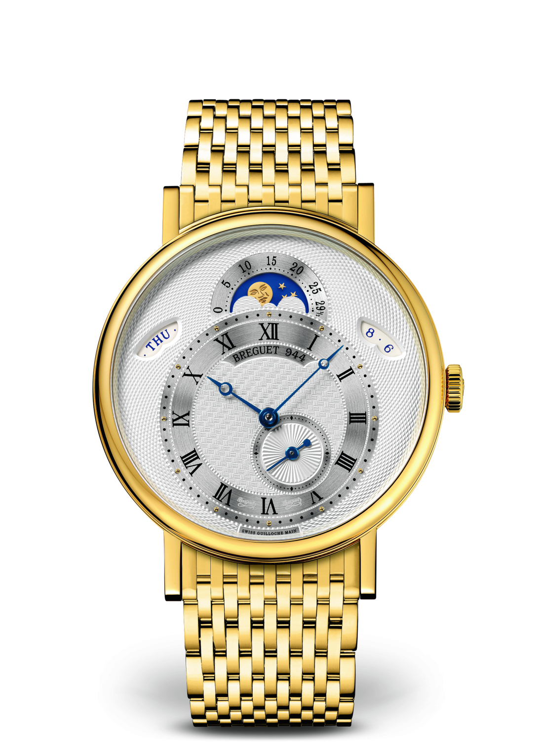 Le tour d’heures excentré vers le bas est survolé par les indémodables aiguilles Breguet à « pomme excentrée ». Il est surmonté par la phase de lune représentée par une pastille en or en reliefs martelés. L’astre repose sur un ciel en laque. À 10 h et 2 h figurent deux ouvertures qui affichent le jour et la date. Cette pièce est équipée d’un calibre extra-plat dont la masse oscillante en or est guillochée à la main.