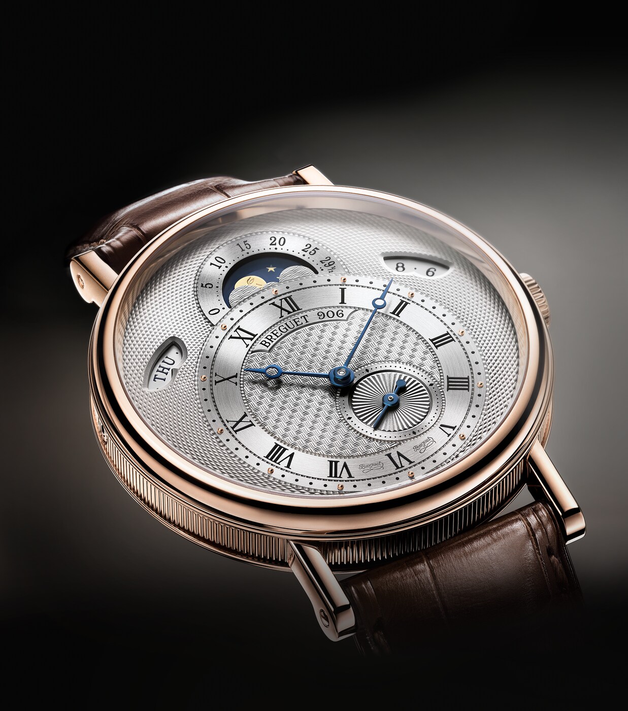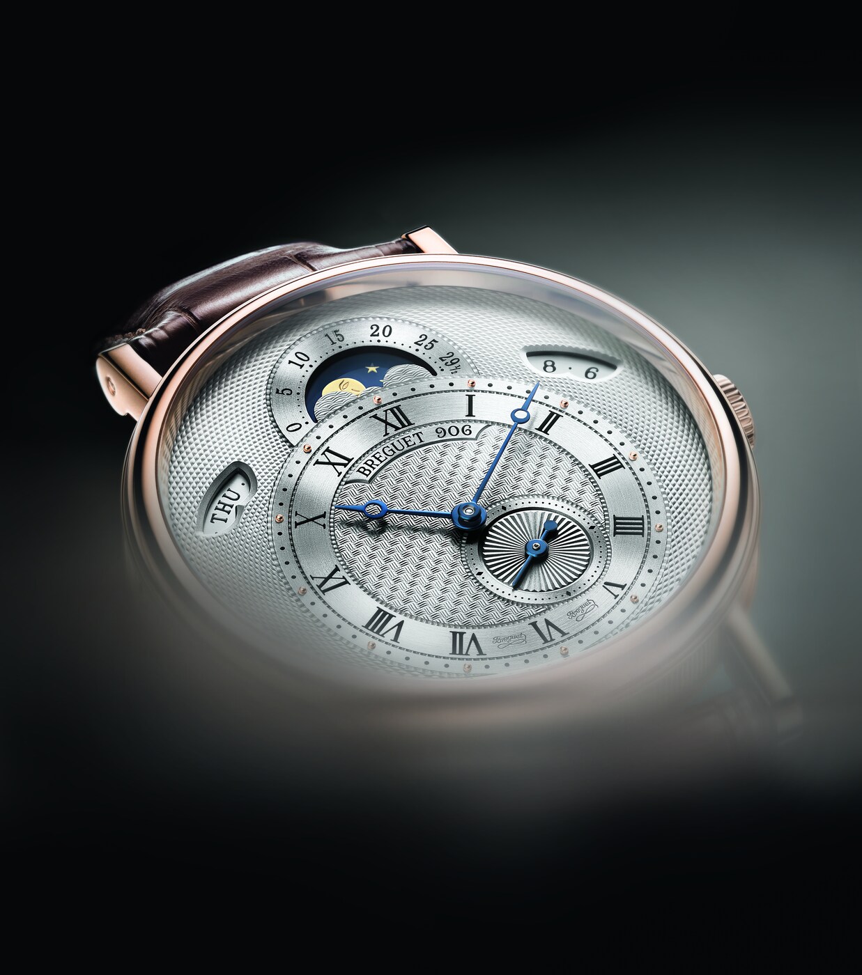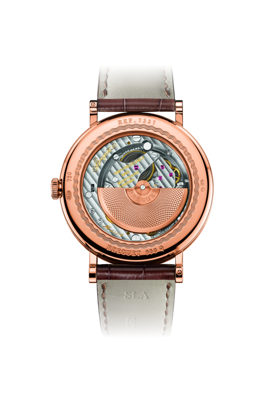 Le tour d’heures excentré vers le bas est survolé par les indémodables aiguilles Breguet à « pomme excentrée ». Il est surmonté par la phase de lune représentée par une pastille en or en reliefs martelés. L’astre repose sur un ciel en laque. À 10 h et 2 h figurent deux ouvertures qui affichent le jour et la date. Cette pièce est équipée d’un calibre extra-plat dont la masse oscillante en or est guillochée à la main.