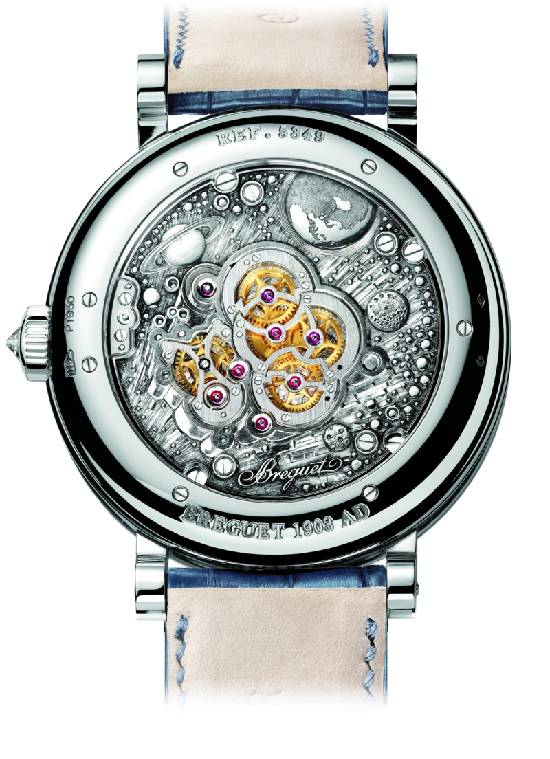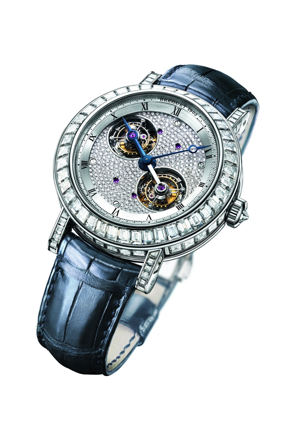 En plus de l’éclat apporté par les deux Tourbillons présents sur ce modèle, un délicat sertissage animent cette pièce en platine.