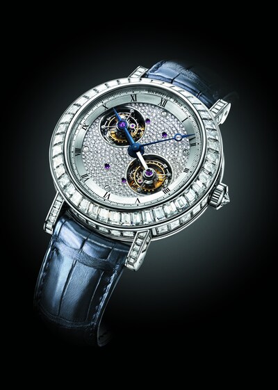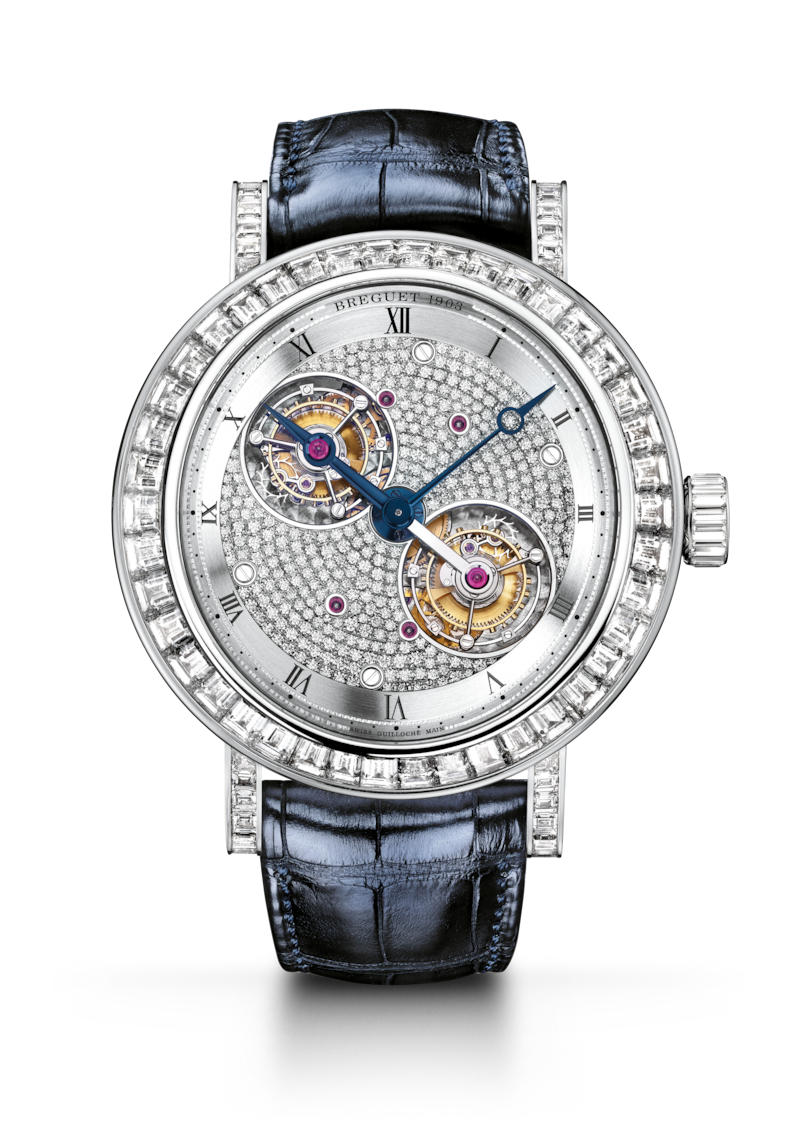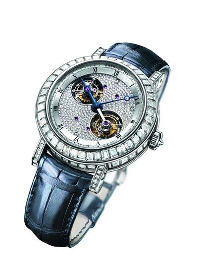 La Classique Double Tourbillon tournant est le résultat de nombreuses années de développement et sa réalisation est protégée par trois brevets. Chaque Tourbillon, indépendant l’un de l’autre, est couplé au moyen d’un engrenage différentiel et fixé sur une platine centrale tournante, dont la rotation s’effectue en 12 heures. Côté esthétique, la boîte de 50mm possède une lunette échancrée pavée de diamants taille baguette, tout comme les attaches et la carrure. Le tour de la couronne est quant à lui orné de 21 diamants baguette.