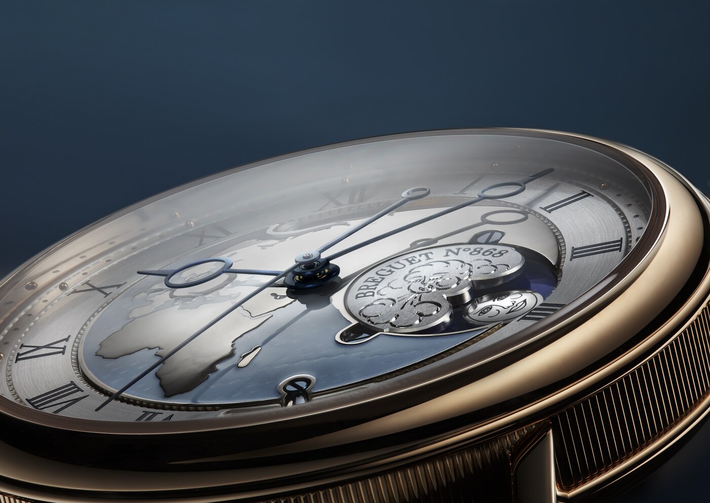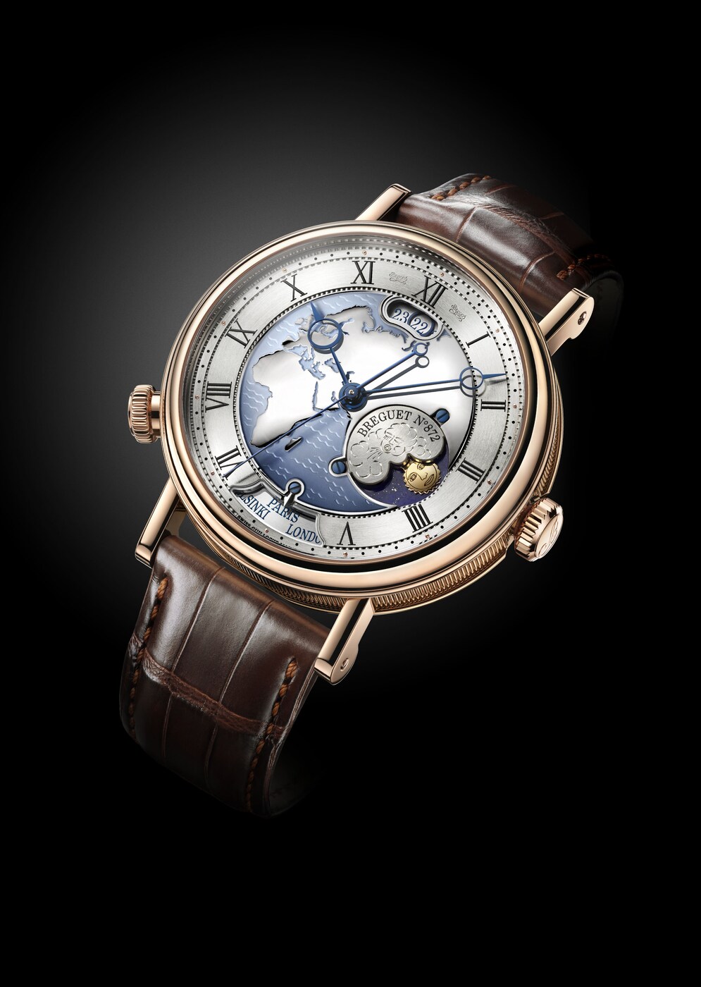 Cette fonction permet au voyageur d’afficher simplement l’heure de deux fuseaux horaires présélectionnés en passant de l’un à l’autre de manière instantanée, par simple pression sur un poussoir. Tout cela bien entendu sans perturber la marche de la montre dont la précision, lors de la mise à l’heure, est assurée par un système de stop seconde. Ce changement de fuseau horaire agit non seulement sur l’heure, mais également sur la date, synchronisée au moyen d’un système de quantième « suiveur », ainsi sur l’indication jour/nuit.