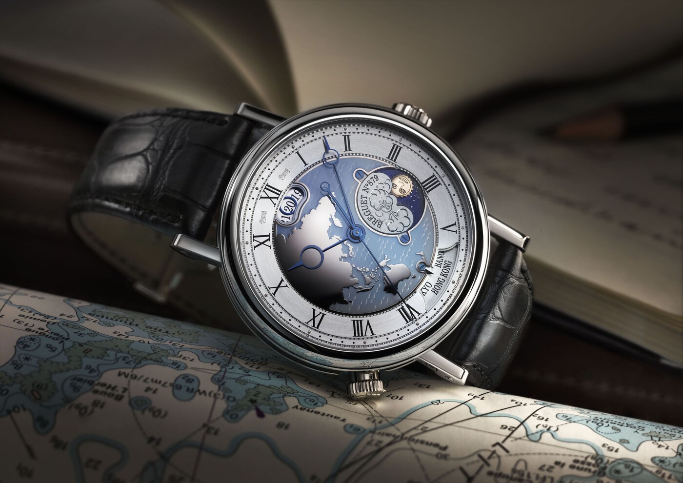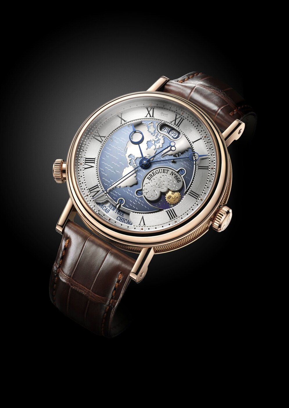 Proposé avec un cadran représentant le continent américain, les continents européen et africain ou l’Asie et l’Océanie, cette montre mécanique est la première à disposer d’un fuseau horaire à mémoire et changement instantané.