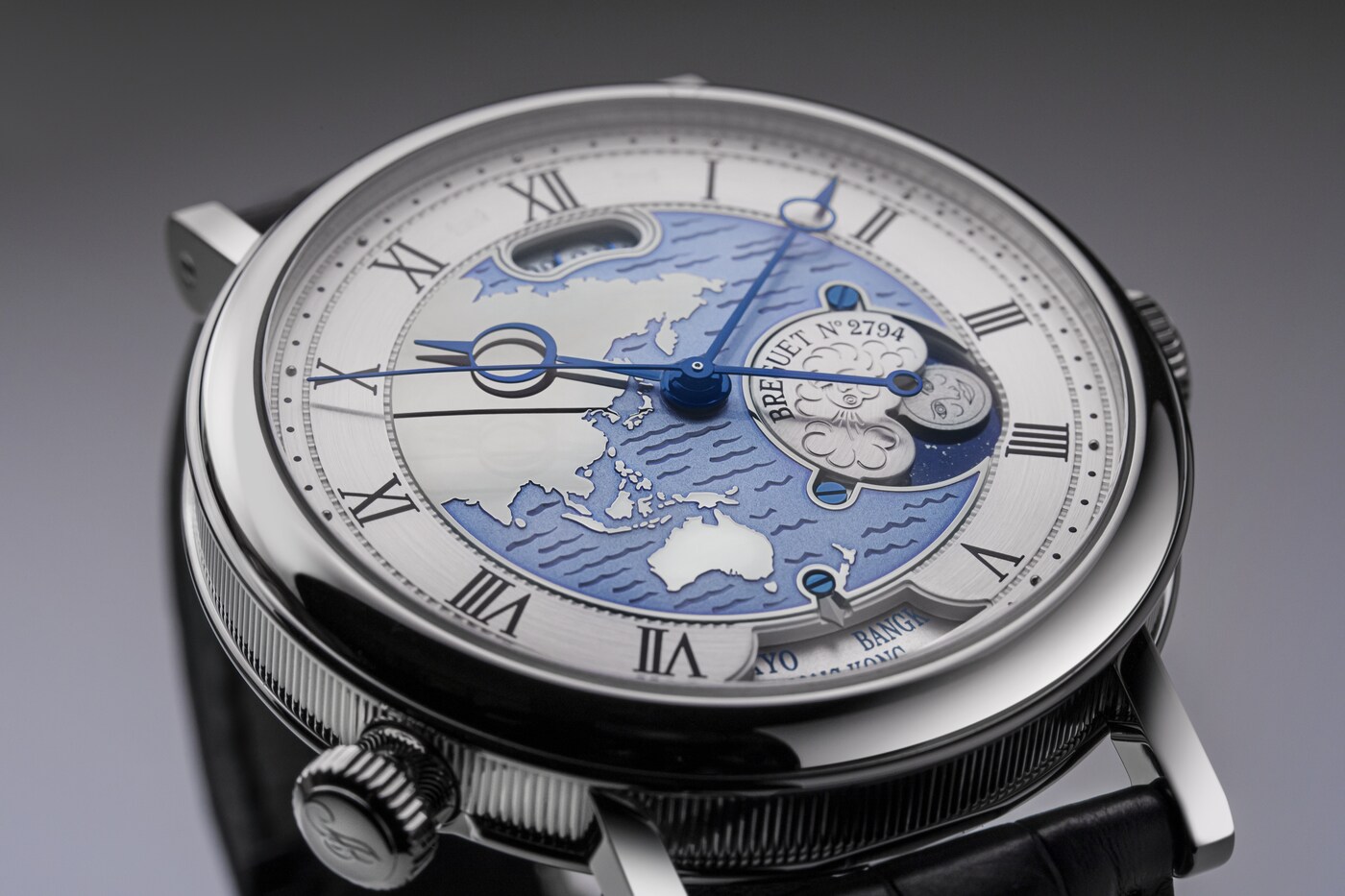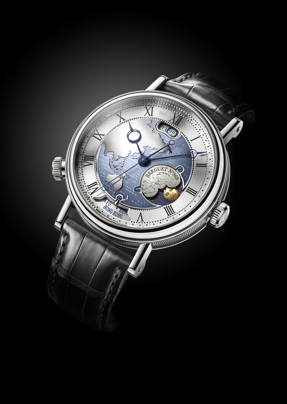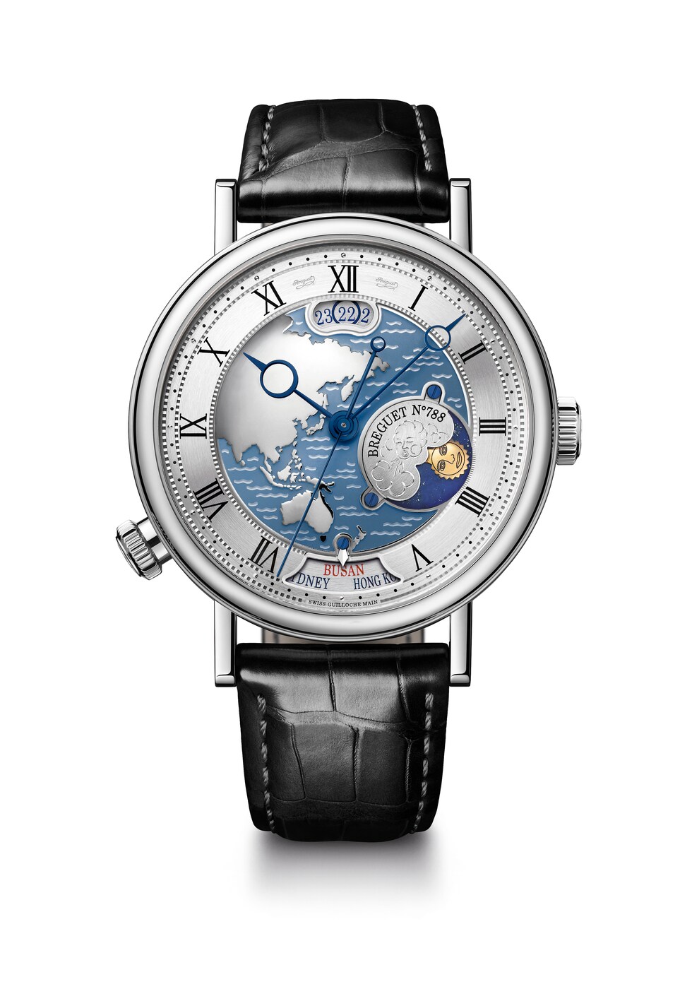 Proposé avec un cadran représentant le continent américain, les continents européen et africain ou l’Asie et l’Océanie, cette montre mécanique est la première à disposer d’un fuseau horaire à mémoire et changement instantané.