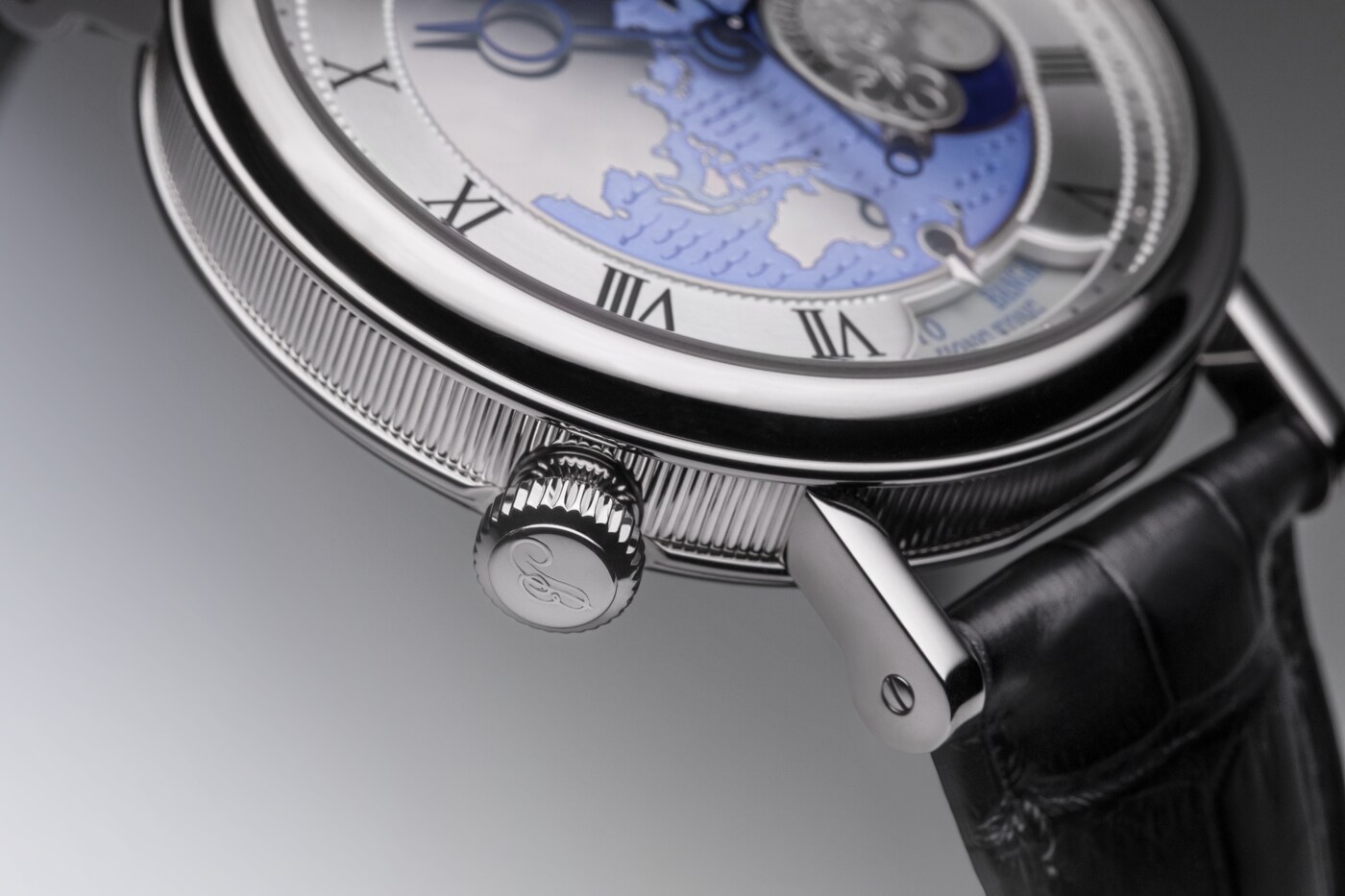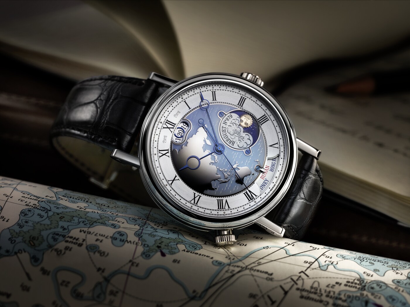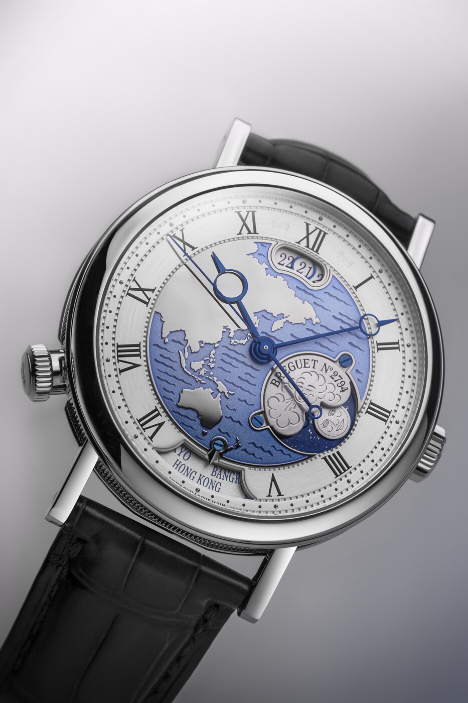 Proposé avec un cadran représentant le continent américain, les continents européen et africain ou l’Asie et l’Océanie, cette montre mécanique est la première à disposer d’un fuseau horaire à mémoire et changement instantané.
