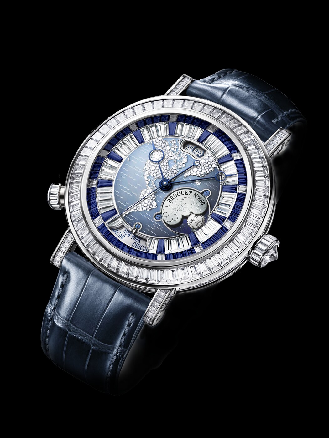 La première montre mécanique à disposer d’un fuseau horaire à mémoire et changement instantané se pare de diamants et de saphirs.