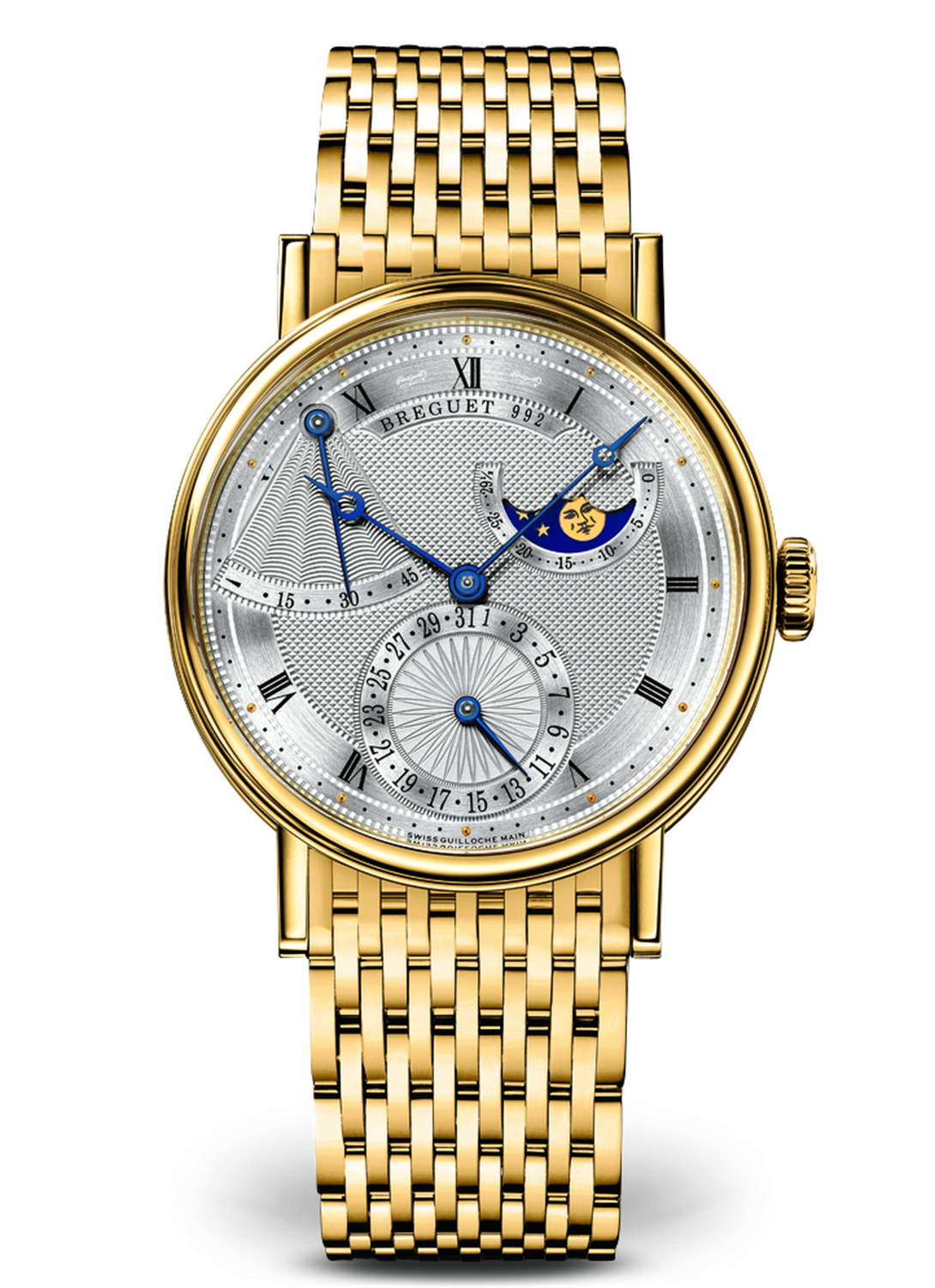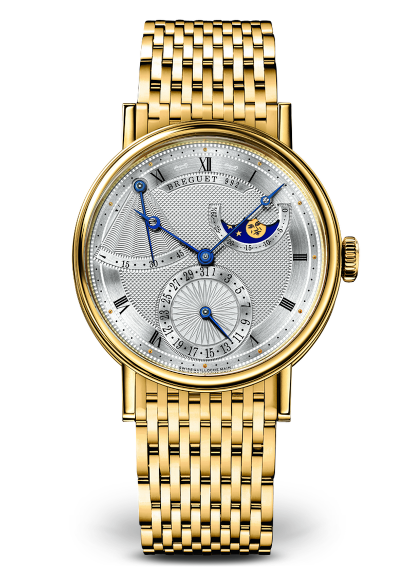 Ce modèle qui affiche la réserve de marche ainsi que la phase de lune fait la part belle au guillochage.