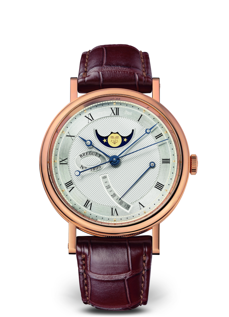 Dotée des fonctions heure, minute et seconde au centre, cette référence est aussi pourvue de deux complications : une phase de lune située à 12 h, et une réserve de marche à 3 h. La lecture de cette indication s’effectue grâce à une aiguille allongée particulièrement lisible et élégante.