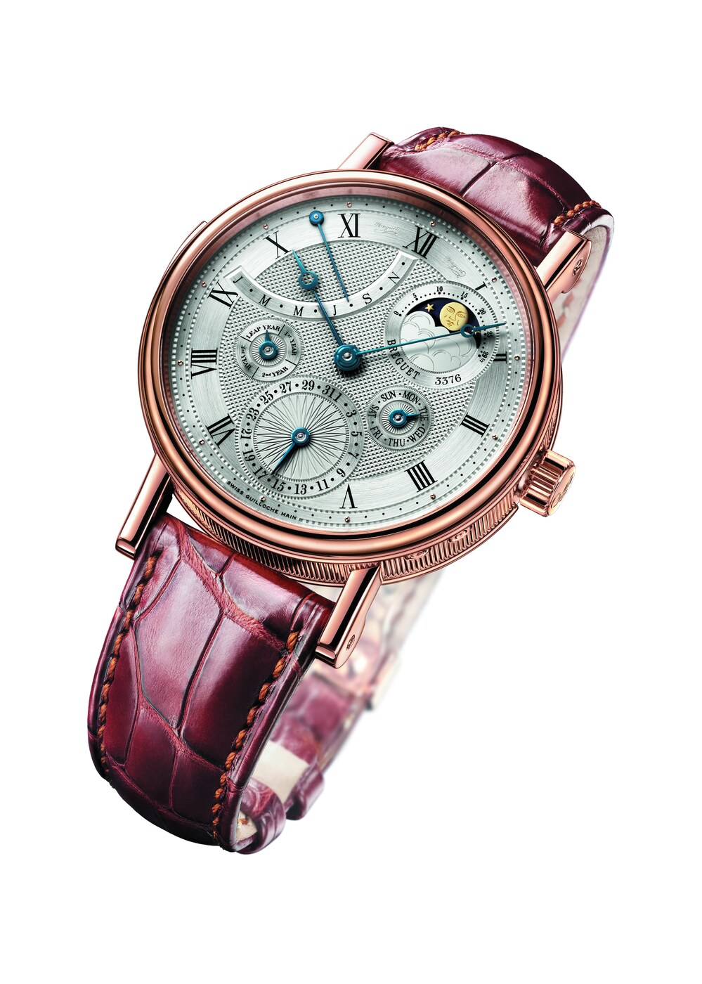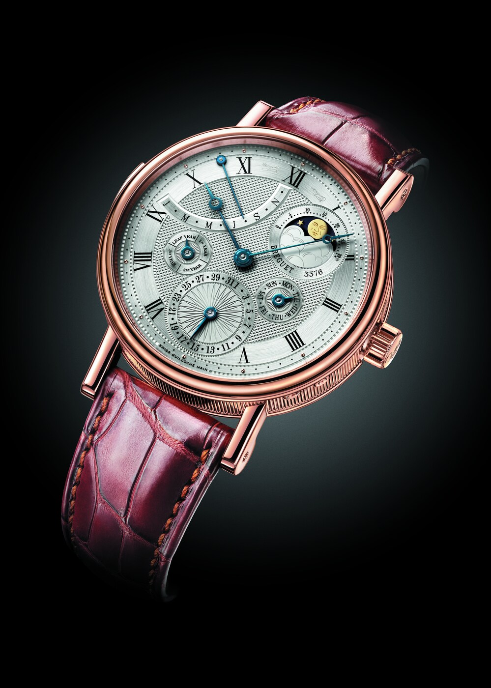 Au-delà d’un simple calendrier, cette fonction est capable d’indiquer la date et le jour, en tenant compte des mois longs et courts, ajoutant ainsi un jour en février tous les 4 ans. Côté esthétique, la Classique 5447 abrite un mouvement entièrement ciselé à la main qui actionne un mécanisme complexe d’affichage rétrograde du mois, situé à 10 h 30. Au terme de l’année, l’aiguille parcourant l’arc de cercle de l’indication des mois effectue un saut quasi instantané pour revenir au mois de janvier, et reprendre sa course. Le quantième se lit à 6 h sur un cadran guilloché d’un motif en soleil dont chacun des rayons correspond à une date. Les indications des jours de la semaine et de l’année bissextile se trouvent en vis-à-vis à 3 h 30 et 8 h 30. Enfin, les phases de la lune apparaissent à 1 h 30.