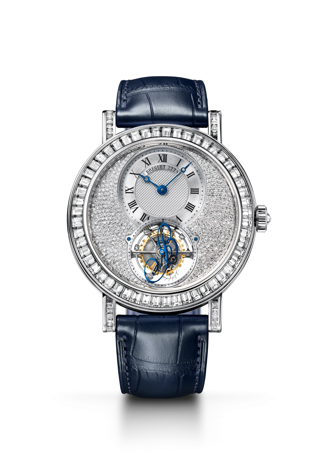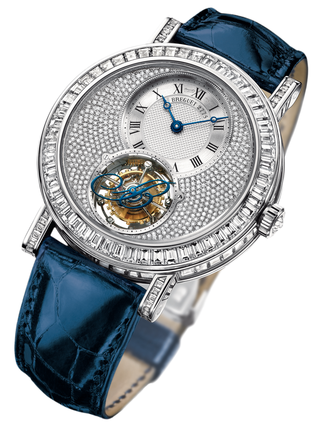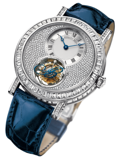 Le Tourbillon est la complication phare de Breguet que l’on doit à son fondateur, A.-L. Breguet. Le mouvement de ce modèle – à remontage manuel – comporte au dos la mention « Brevet du 7 Messidor An 9 », en référence à la date du dépôt et qui est l’équivalent du calendrier républicain du 26 juin 1801. Côté face, le Tourbillon est surmonté d’une barrette en forme de « B » bleui, tout comme le sont les éponymes aiguilles Breguet à « pomme excentrée ». La décoration se poursuite sur la lunette, les cornes et la couronne qui se parent de diamants.