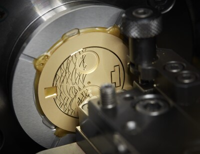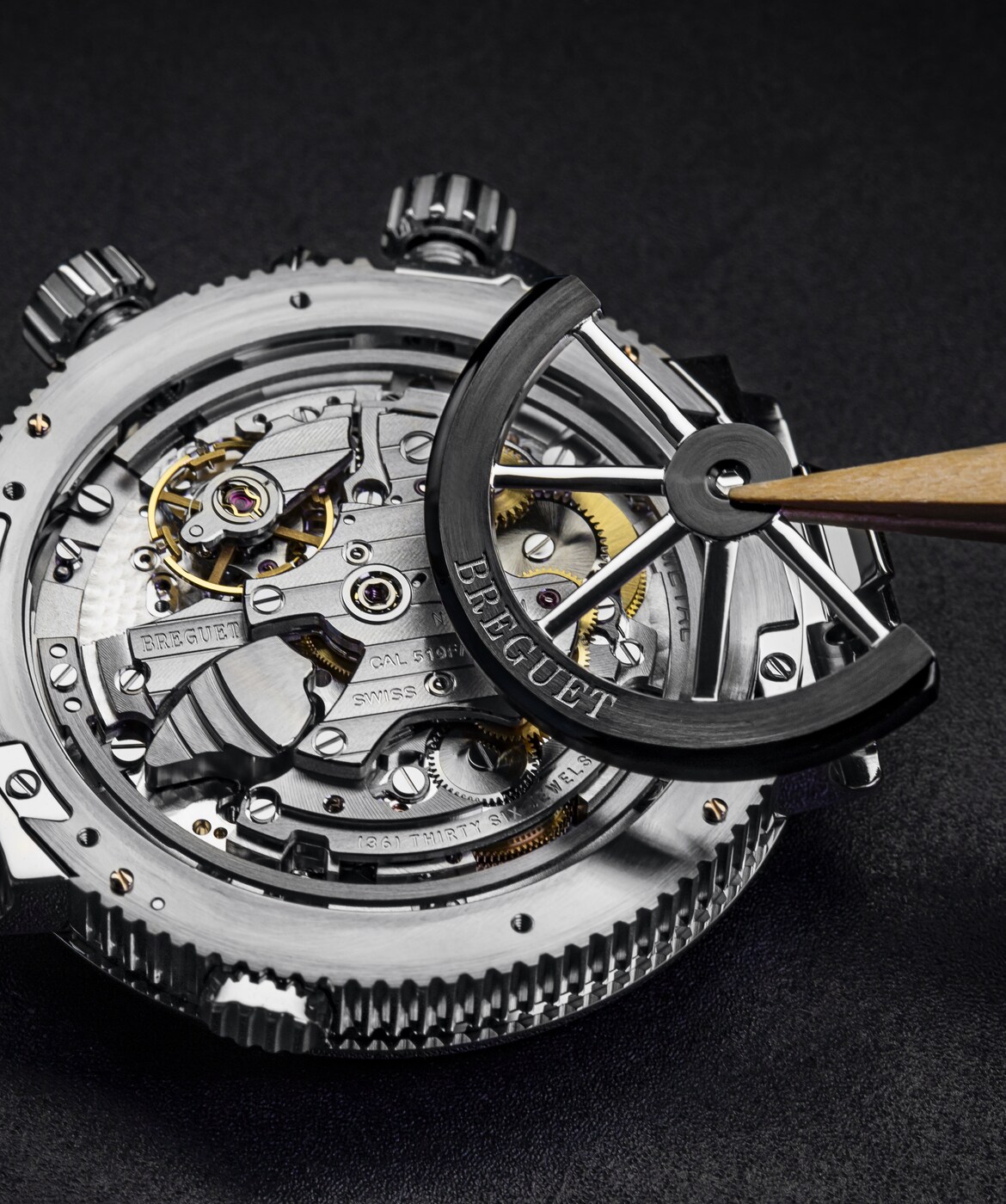 Un compteur 12 heures placé à 3 h indique l’heure choisie pour l’alarme. Une cloche de marine, subtil clin d’œil à l’univers de la collection, s’affiche dans une ouverture à 12 h lorsque la sonnerie est enclenchée. Sa réserve de marche est visible en toute discrétion entre 9 h et 12 h. Lorsque la pièce est complètement armée, la flèche pointe vers l’indication entièrement colorée, à 9 h. Le compteur positionné à 9 h affiche quant à lui le second fuseau horaire. Afin de permettre une lecture aisée de l’heure de jour comme de nuit, les aiguilles et les repères sont luminescents.