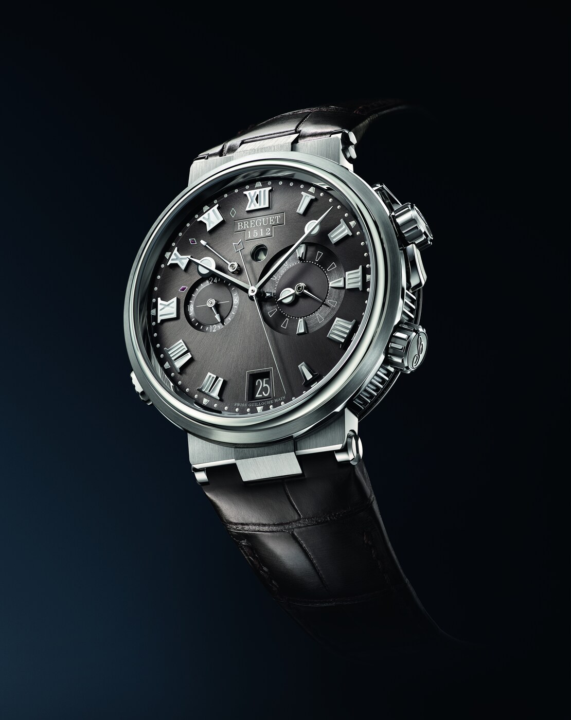 Un compteur 12 heures placé à 3 h indique l’heure choisie pour l’alarme. Une cloche de marine, subtil clin d’œil à l’univers de la collection, s’affiche dans une ouverture à 12 h lorsque la sonnerie est enclenchée. Sa réserve de marche est visible en toute discrétion entre 9 h et 12 h. Lorsque la pièce est complètement armée, la flèche pointe vers l’indication entièrement colorée, à 9 h. Le compteur positionné à 9 h affiche quant à lui le second fuseau horaire. Afin de permettre une lecture aisée de l’heure de jour comme de nuit, les aiguilles et les repères sont luminescents.