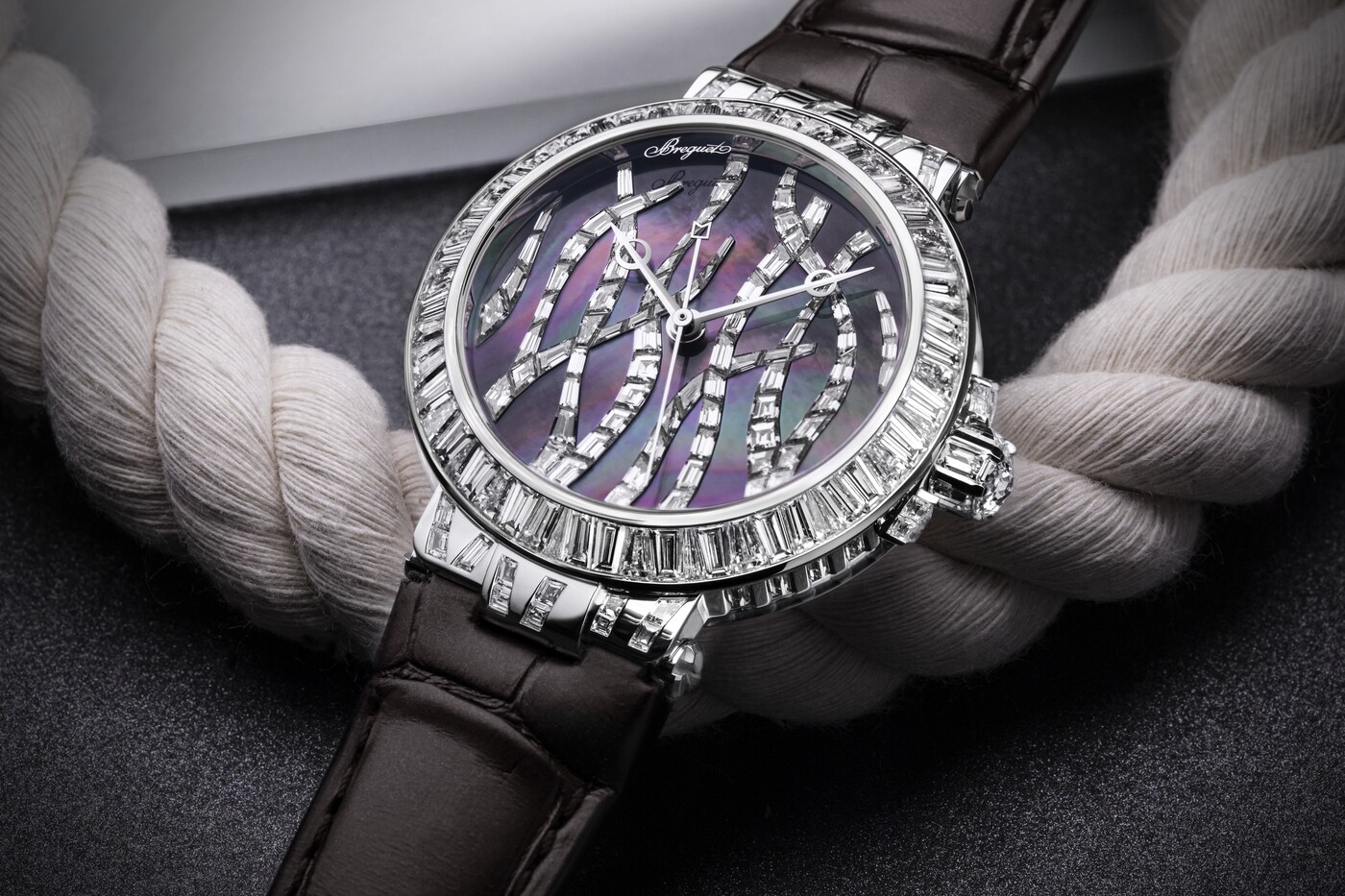 Sur ce modèle Haute Joaillerie, Breguet rend hommage à une plante aquatique indispensable à l’équilibre des fonds de la Méditerranée, la posidonie.