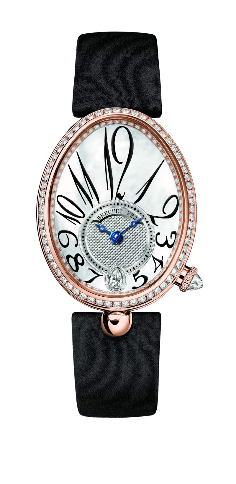 Cette montre se distingue par ses chiffres Breguet, largement agrandis, qui épousent le cadran et entourent le tour d’heures.