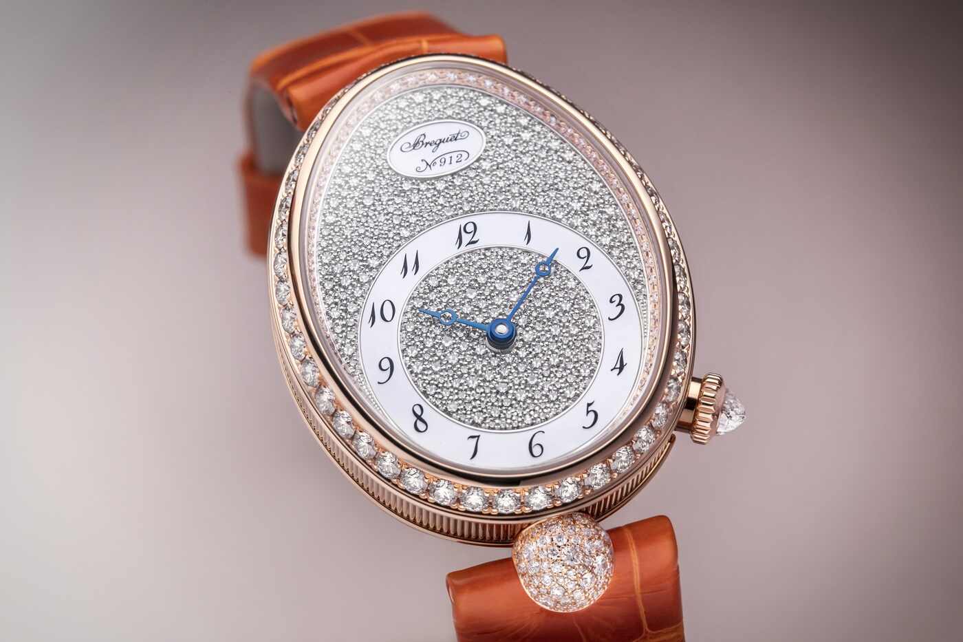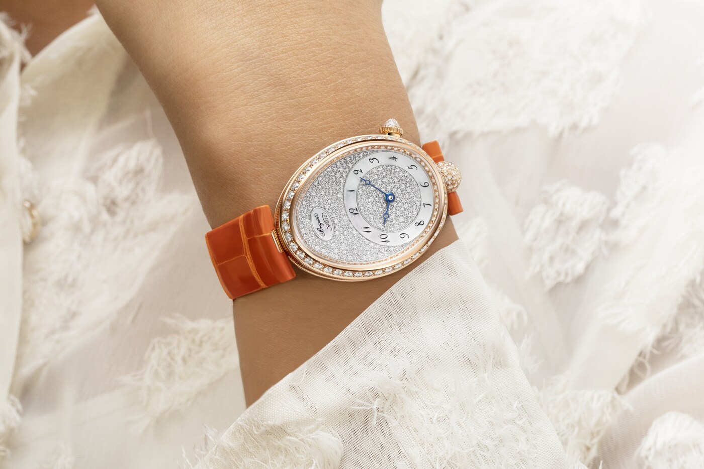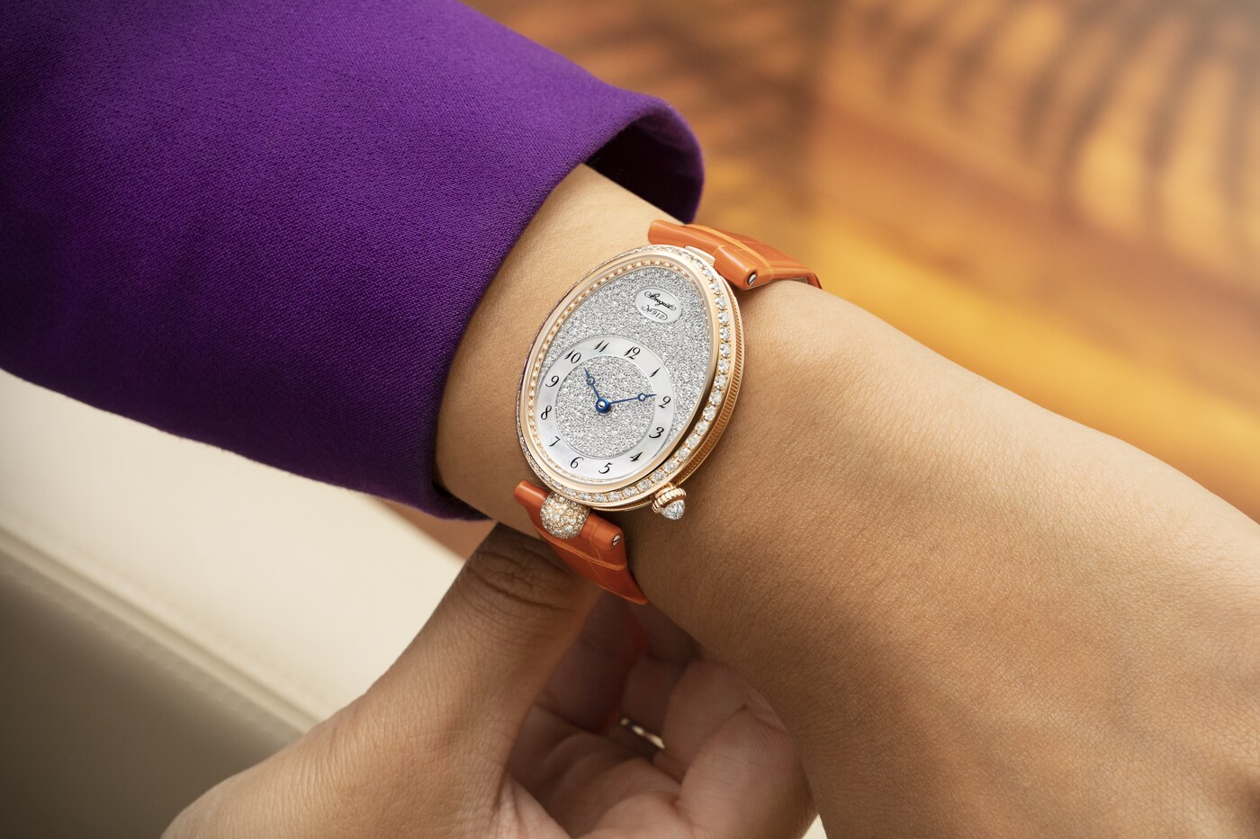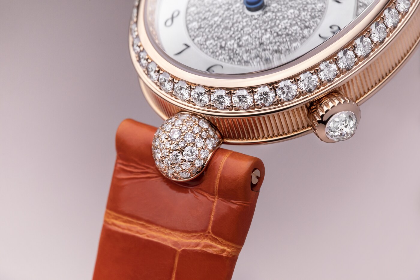 Plus de 3 carats de diamants illuminent ce modèle dont le cadran est serti selon la technique du sertissage neige.