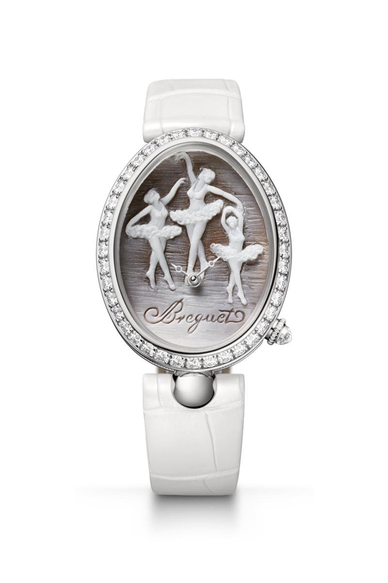 Chacune des Reine de Naples 8958 se dédie à l’expression d’un ou plusieurs métiers d’art. Outre le gravage ou l’émaillage, un des modèles met à l’honneur l’art du camée. Cette technique consiste en la gravure de coquillages présentant des strates de couleur contrastées. L’artisan travaille les couches intérieures d’à peine quelques millimètres d’épaisseur jusqu’à obtenir une délicate sculpture. Chaque réalisation est renfermée dans une boîte ovoïde, une des caractéristiques principales de la collection Reine de Naples.