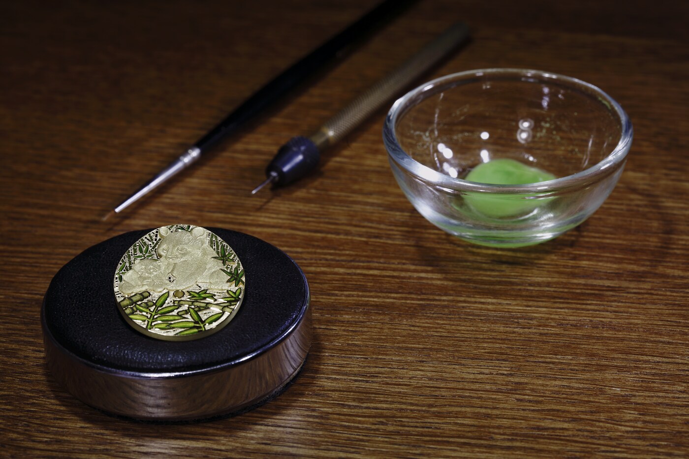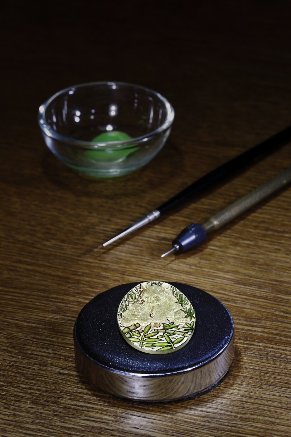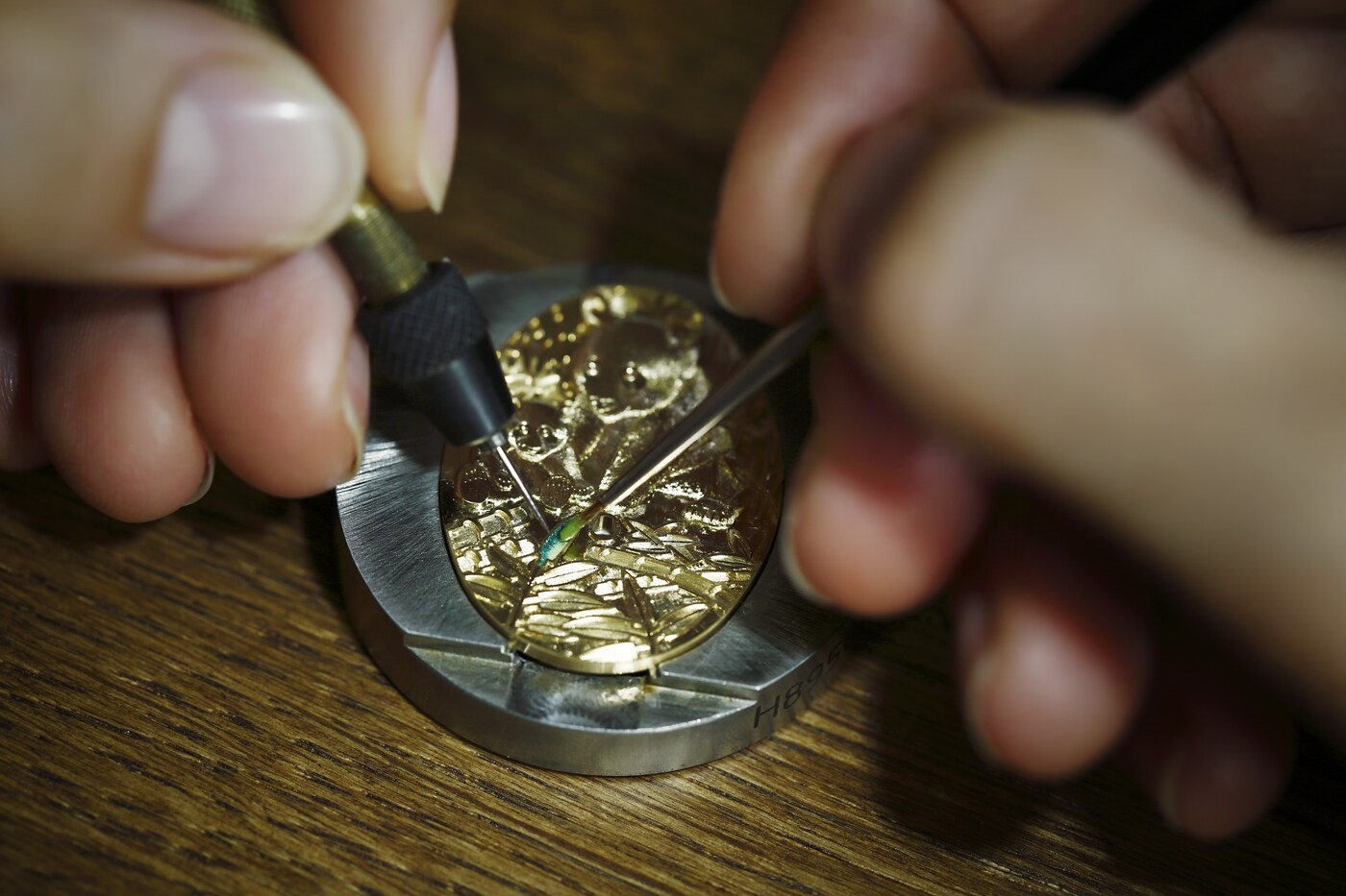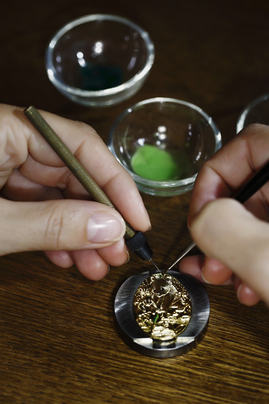 Chacune des Reine de Naples 8958 se dédie à l’expression d’un ou plusieurs métiers d’art. Outre le gravage ou l’émaillage, un des modèles met à l’honneur l’art du camée. Cette technique consiste en la gravure de coquillages présentant des strates de couleur contrastées. L’artisan travaille les couches intérieures d’à peine quelques millimètres d’épaisseur jusqu’à obtenir une délicate sculpture. Chaque réalisation est renfermée dans une boîte ovoïde, une des caractéristiques principales de la collection Reine de Naples.