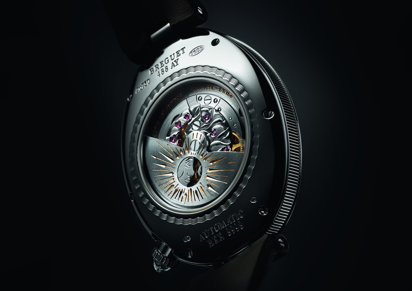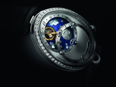 Le mouvement breveté que renferme ce modèle se dote d’un affichage avec 2 cadrans, l’un représentant les heures et les minutes de manière traditionnelle, et le second mettant en scène la complication pour indiquer les heures du jour et de la nuit. Le ciel est représenté par un disque en lapis-lazuli incrusté de nuages en nacre naturelle blanche, d’étoiles en or ainsi que d’une lune en titane gravée à la main. Mais la véritable vedette est le soleil, représenté par la serge du balancier facetté qui évoque les rayons du soleil. Il effectue une rotation sur une journée complète, passant sous le pont en acier qui soutient le mécanisme et faisant toujours face à la lune.