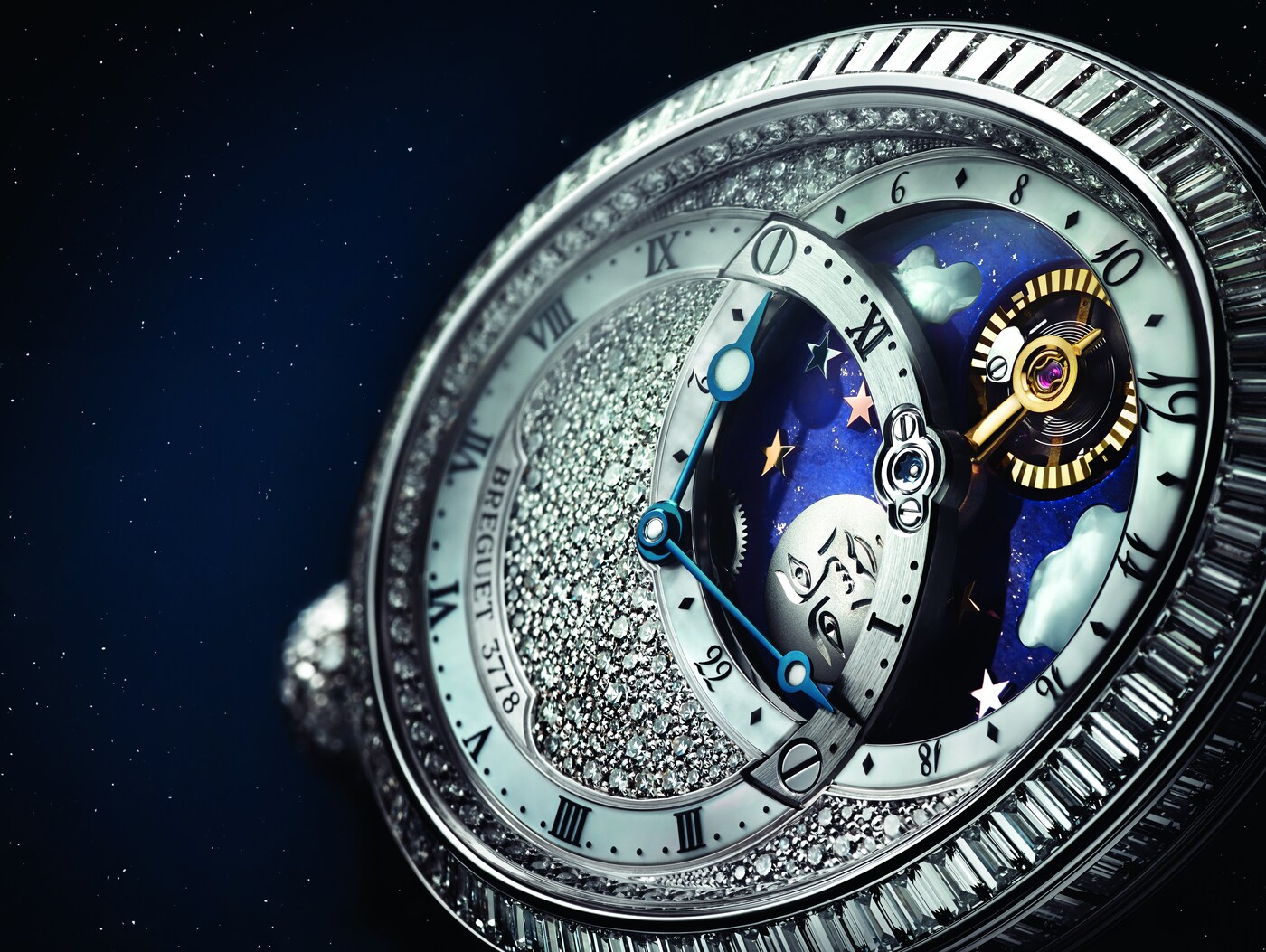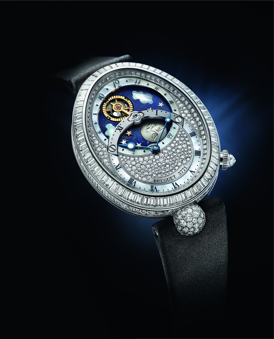 L’expertise mécanique de Breguet est au rendez-vous avec cette montre équipée d’un mouvement exclusif à la collection Reine de Naples qui affiche les heures et les minutes, mais surtout qui anime une seconde partie du cadran dédiée à la représentation poétique des heures du jour et de la nuit.